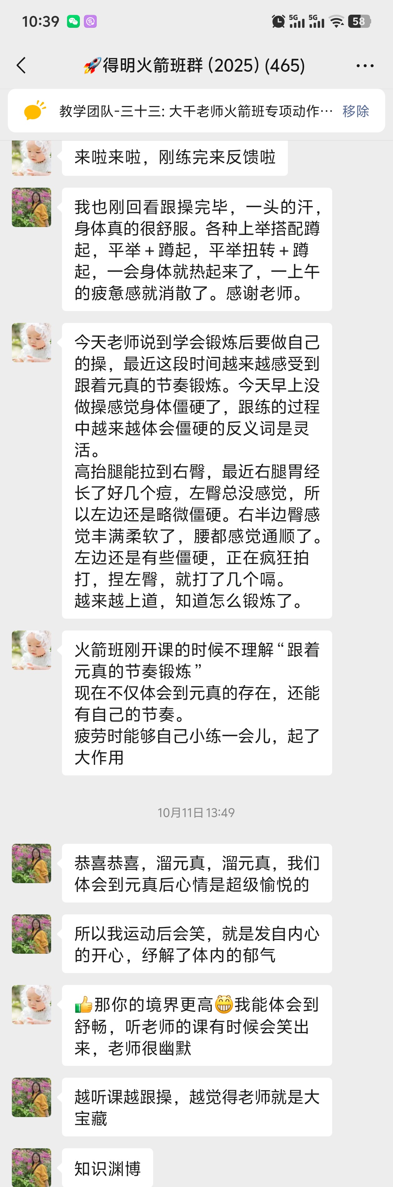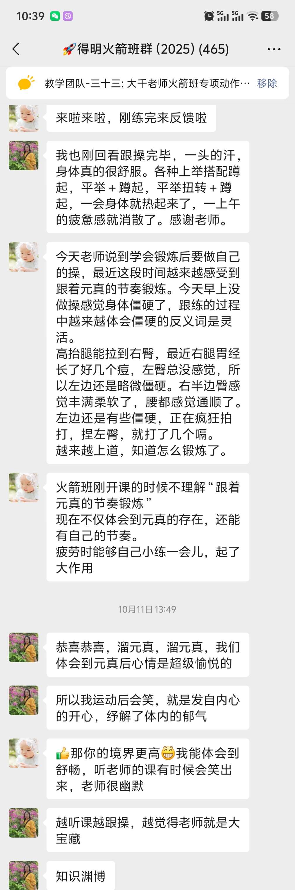 火箭班学员反馈:跟操消除疲惫、跟着元真的节奏锻炼、溜元真、老师就是大宝藏 https://dmjs.info/m/dv_topic/view.asp?id=10032225&t=1761994149