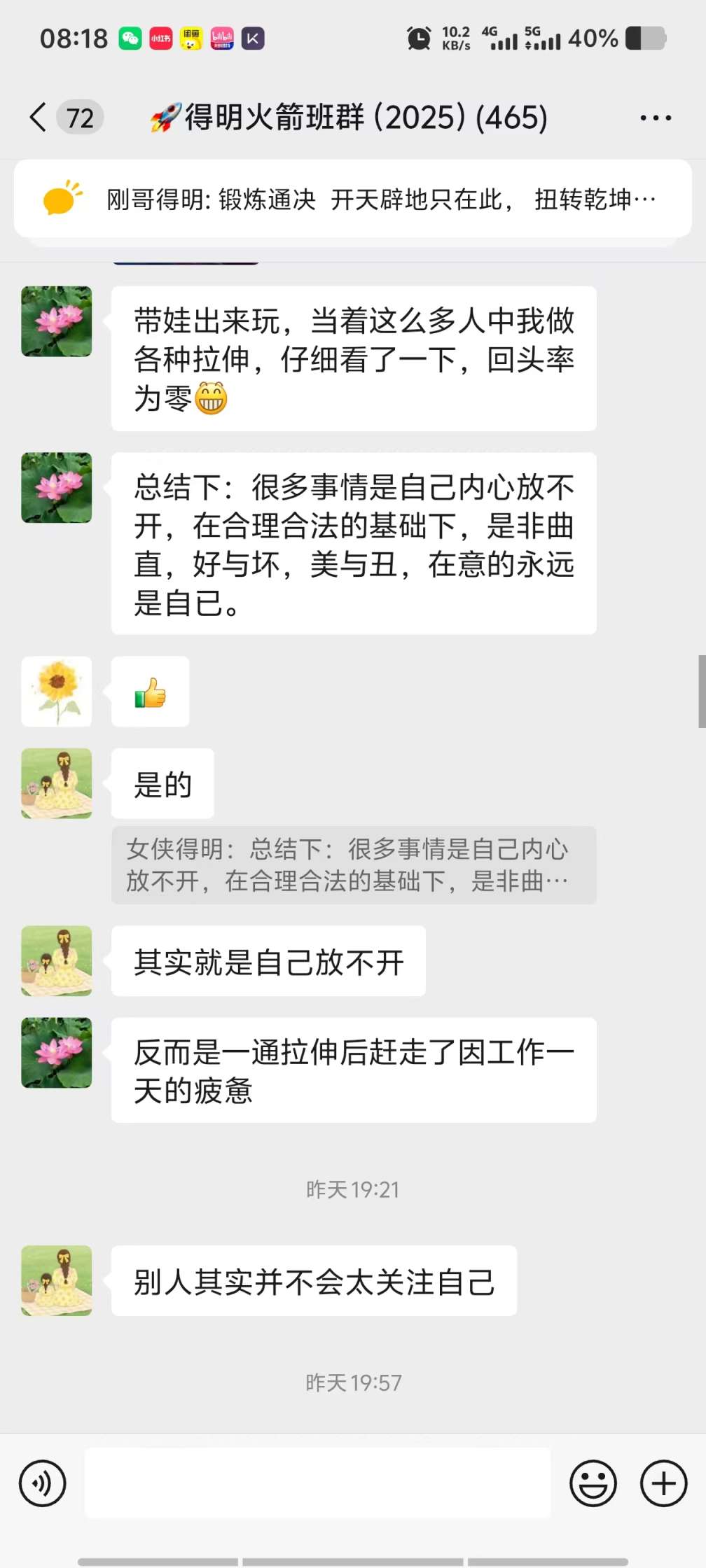 火箭班学员聊放开:带娃出来玩顺便做拉伸,回头率为零,原来放不开的是自己。在合理合法的基础下,是非曲直、好与坏、美与丑,在意的永远是自己。