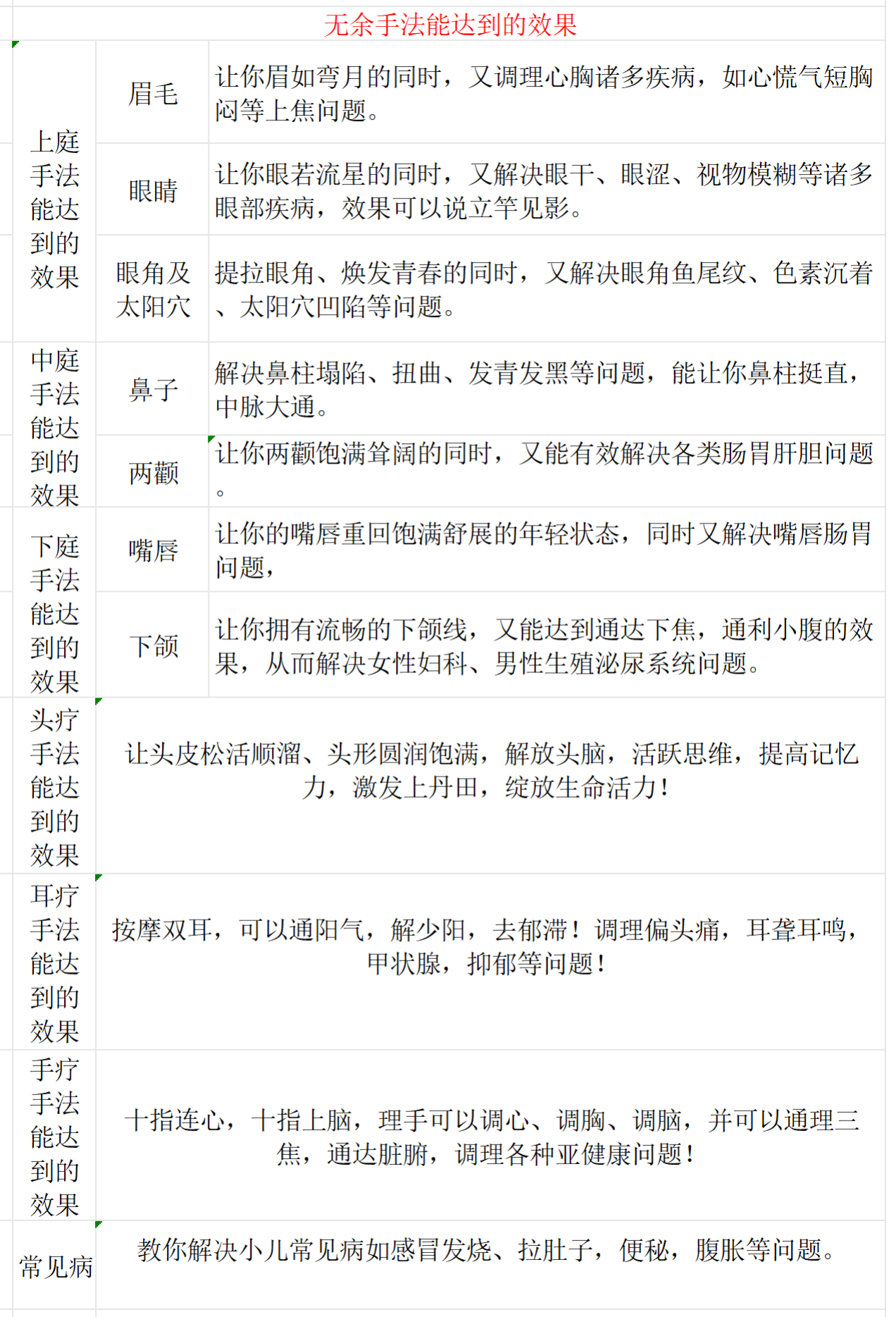 通过系统、全面的方法依次梳理头面部各条经络,来绽放人体生命能量场,通畅五脏六腑,达到调理身体,使头面部得气血滋养的作用。完全区别于其它针对肌肉组织的浅层滋养和调理的理疗手法。