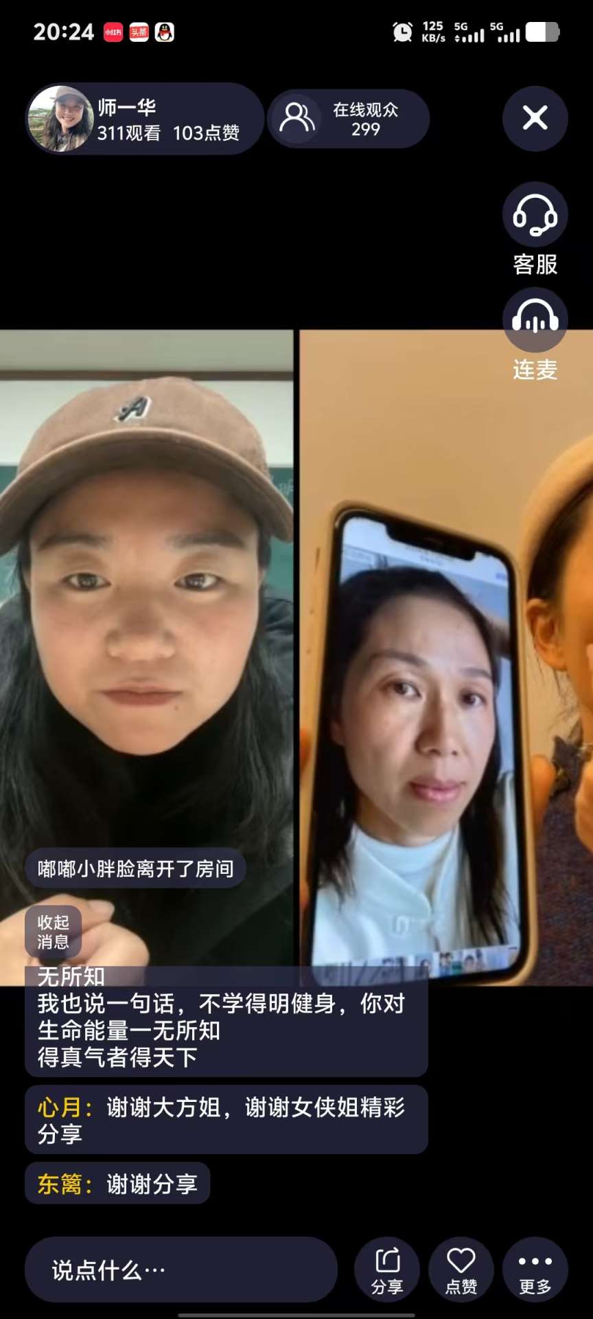 大方师姐:后来我开了一个工作室,新冠那一年他们都得了新冠,到我这来治。我有时候口罩都不戴。我好像无所畏惧,没有染伤,人家还怕的要死,这个就是老师说的正气内存,邪不可干。我一点也不恐惧,我为啥会不恐惧?因为我练出来了,我把正能量树起来了。