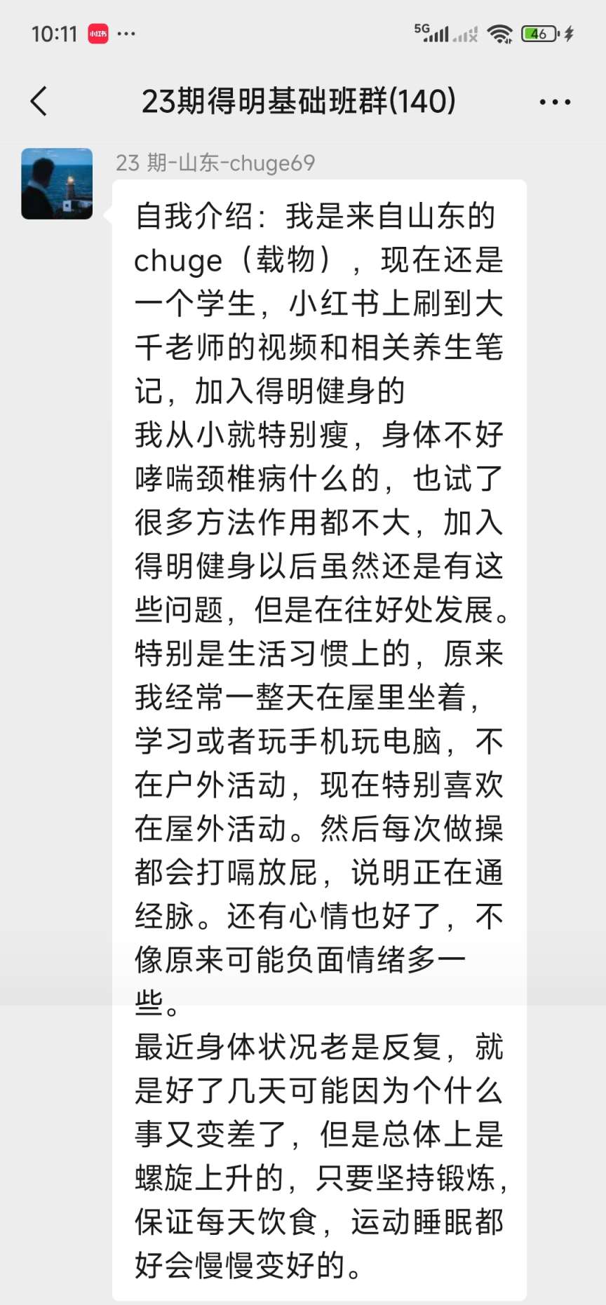 我是来自山东的 chuge(载物),现在还是一个学生,小红书上刷到大千老师的视频和相关养生笔记,加入得明健身的