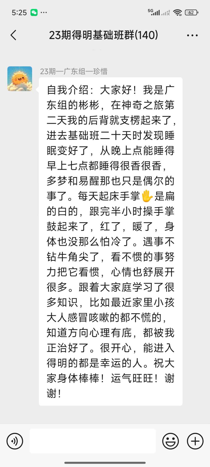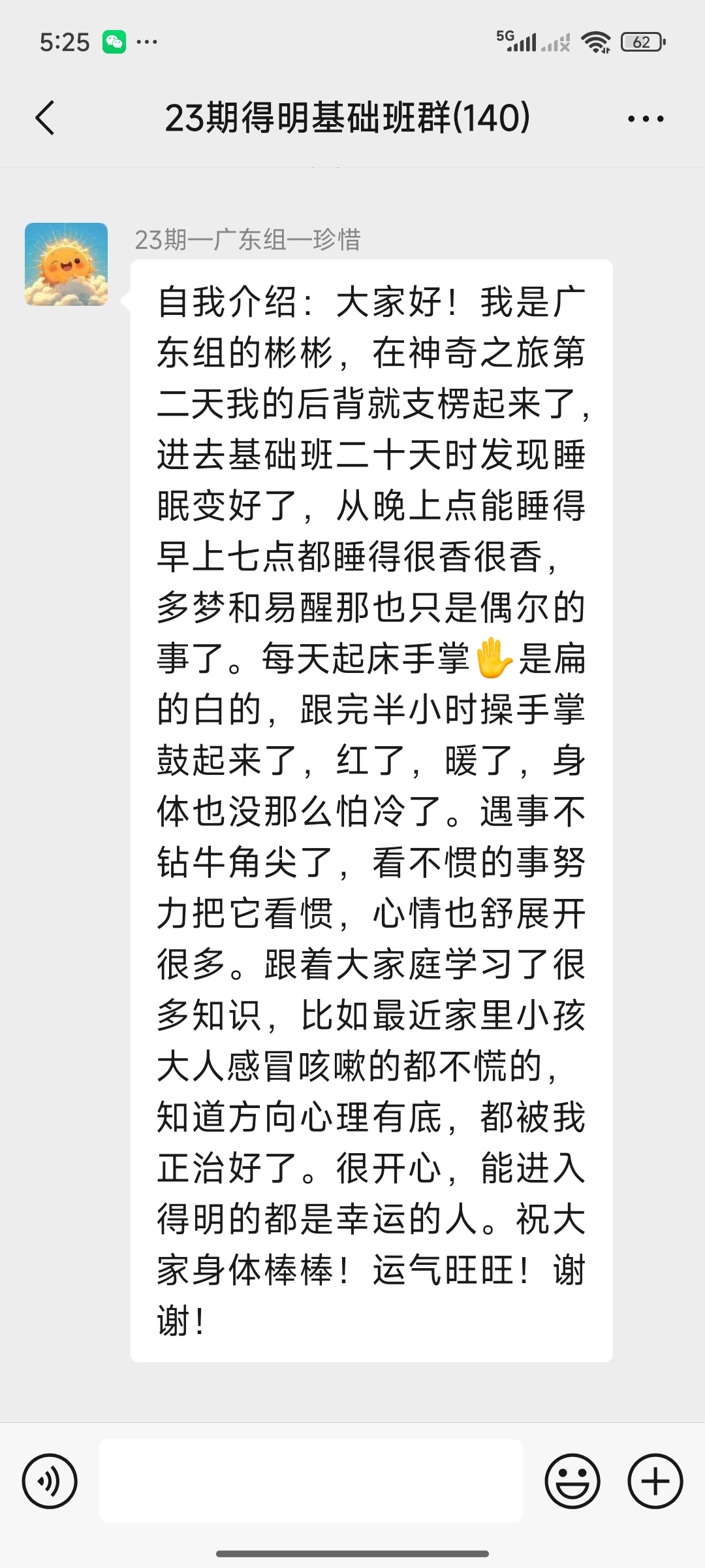 自我介绍:大家好!我是广东组的彬彬,在神奇之旅第二天我的后背就支楞起来了,进去基础班二十天时发现睡眠变好了,从晚上点能睡得早上七点都睡得很香很香,多梦和易醒那也只是偶尔的事了。每天起床手掌✋是扁的白的,跟完半小时操手掌鼓起来了,红了,暖了,身体也没那么怕冷了。遇事不钻牛角尖了,看不惯的事努力把它看惯,心情也舒展开很多。跟着大家庭学习了很多知识,比如最近家里小孩大人感冒咳嗽的都不慌的,知道方向心理有底,都被我正治好了。很开心,能进入得明的都是幸运的人。祝大家身体棒棒!运气旺旺!谢谢!
