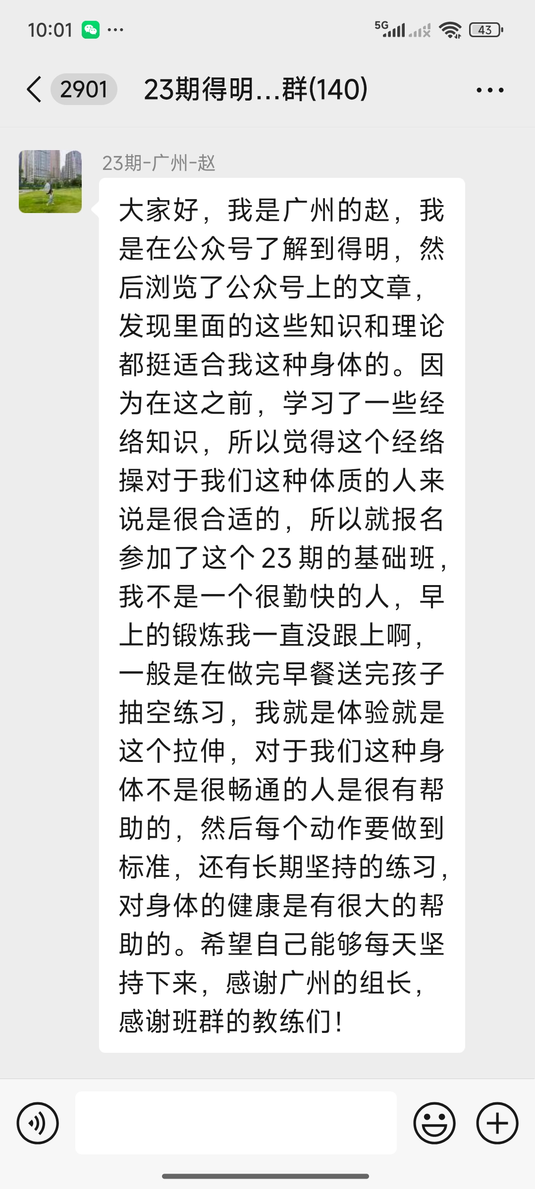 大家好,我是广州的赵,我是在公众号了解到得明,然后浏览了公众号上的文章,发现里面的这些知识和理论都挺适合我这种身体的。因为在这之前,学习了一些经络知识,所以觉得这个经络操对于我们这种体质的人来说是很合适的,所以就报名参加了这个23期的基础班,我不是一个很勤快的人,早上的锻炼我一直没跟上啊,一般是在做完早餐送完孩子抽空练习,我就是体验就是这个拉伸,对于我们这种身体不是很畅通的人是很有帮助的,然后每个动作要做到标准,还有长期坚持的练习,对身体的健康是有很大的帮助的。希望自己能够每天坚持下来,感谢广州的组长,感谢班群的教练们!