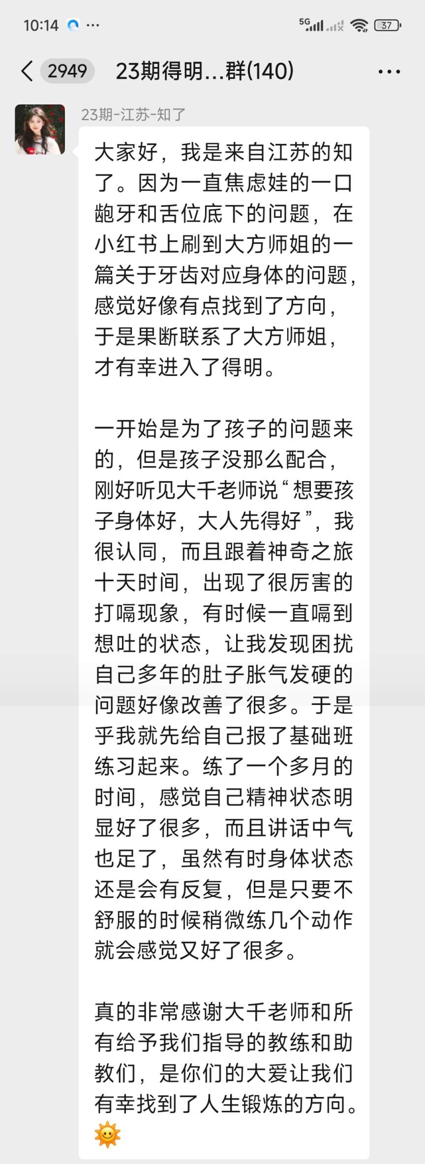 大家好,我是来自江苏的知了。因为一直焦虑娃的一口龅牙和舌位底下的问题,在小红书上刷到大方师姐的一篇关于牙齿对应身体的问题,感觉好像有点找到了方向,于是果断联系了大方师姐,才有幸进入了得明。