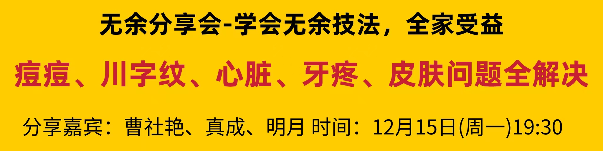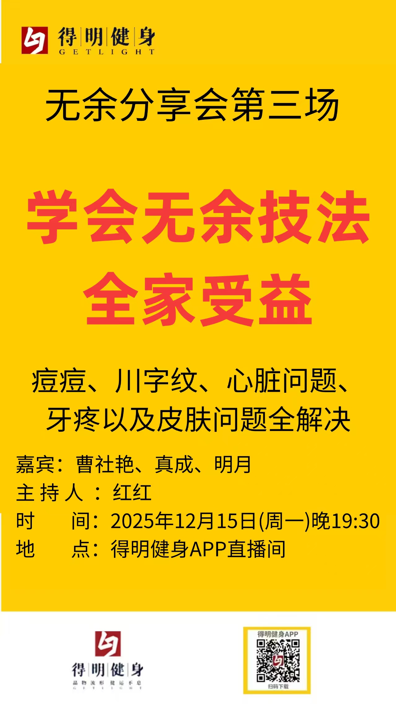 ![]() 原图 下载 一人学会无余技法,全家受益 今晚我们特邀请三位嘉宾:曹社艳师姐、真成师姐、明月师姐 分享他们如何用无余解决痘痘、川字纹、心脏、牙疼、皮肤等问题的。 2025年12月15日(周一)晚19:30无余分享会第三场直播链接http://dmjs.info/m/voteH5/showZb.html?id=10873701 查看得明学习引导>>