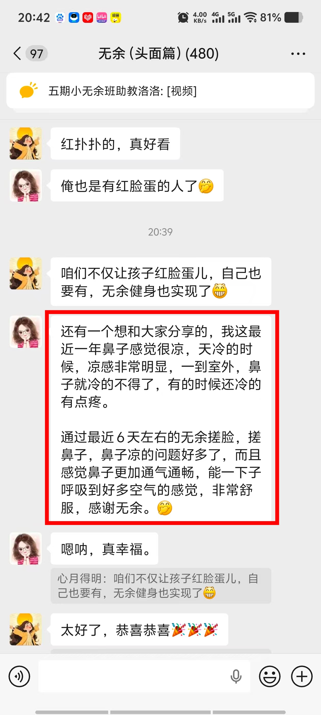 鼻子发凉一年多,尤其天冷时特别明显,通过无余6天左右,感觉鼻子通畅了,鼻子凉的问题也得到了改善。
