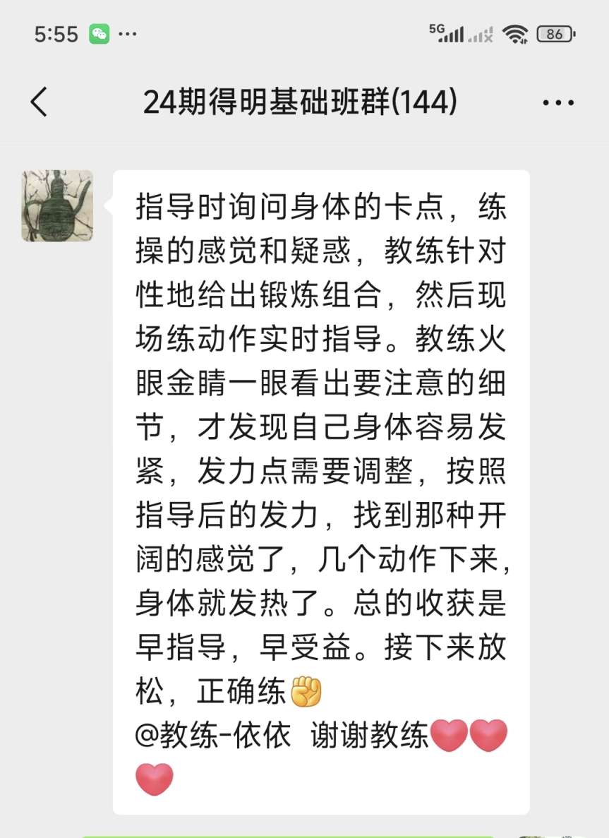 指导时询问身体的卡点,练操的感觉和疑惑,教练针对性地给出锻炼组合,然后现场练动作实时指导。教练火眼金睛一眼看出要注意的细节,才发现自己身体容易发紧,发力点需要调整,按照指导后的发力,找到那种开阔的感觉了,几个动作下来,身体就发热了。总的收获是早指导,早受益。接下来放松,正确练[拳头]