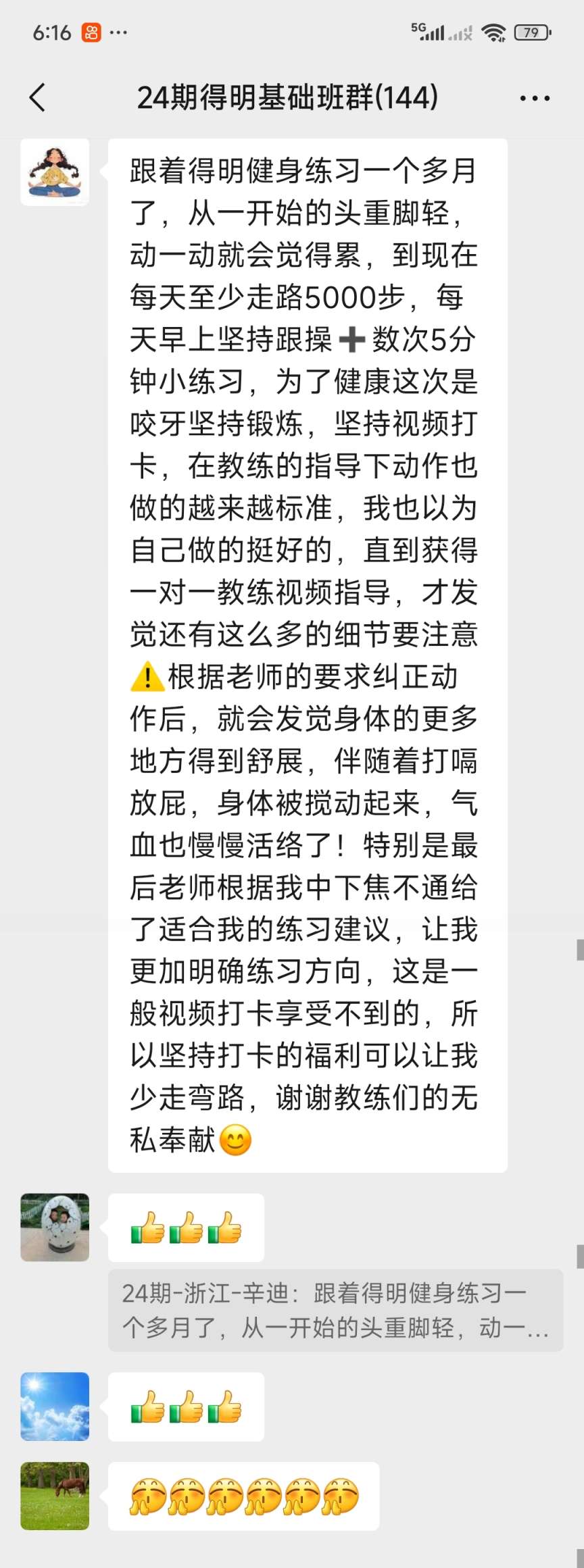跟着得明健身练习一个多月了,从一开始的头重脚轻,动一动就会觉得累,到现在每天至少走路5000步,每天早上坚持跟操➕数次5分钟小练习,为了健康这次是咬牙坚持锻炼,坚持视频打卡,在教练的指导下动作也做的越来越标准,我也以为自己做的挺好的,直到获得一对一教练视频指导,才发觉还有这么多的细节要注意⚠️根据老师的要求纠正动作后,就会发觉身体的更多地方得到舒展,伴随着打嗝放屁,身体被搅动起来,气血也慢慢活络了!特别是最后老师根据我中下焦不通给了适合我的练习建议,让我更加明确练习方向,这是一般视频打卡享受不到的,所以坚持打卡的福利可以让我少走弯路,谢谢教练们的无私奉献😊