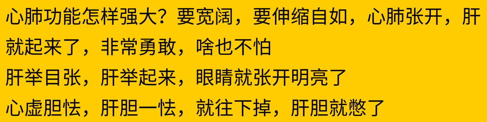 师:心肺功能怎样强大?要宽阔,要伸缩自如,心肺张开,肝就起来了,非常勇敢,啥也不怕