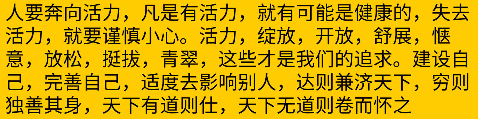 师:人要奔向活力,凡是有活力,就有可能是健康的,失去活力,就要谨慎小心,活力,绽放,开放,舒展,惬意,放松,挺拔,青翠,这些才是我们的追求,建设自己,完善自己,适度去影响别人,达则兼济天下,穷则独善其身,天下有道则仕,天下无道则卷而怀之