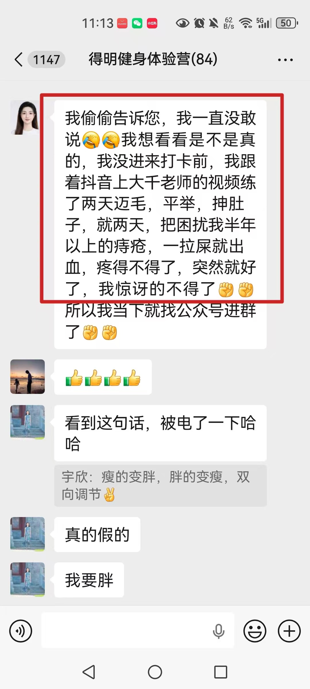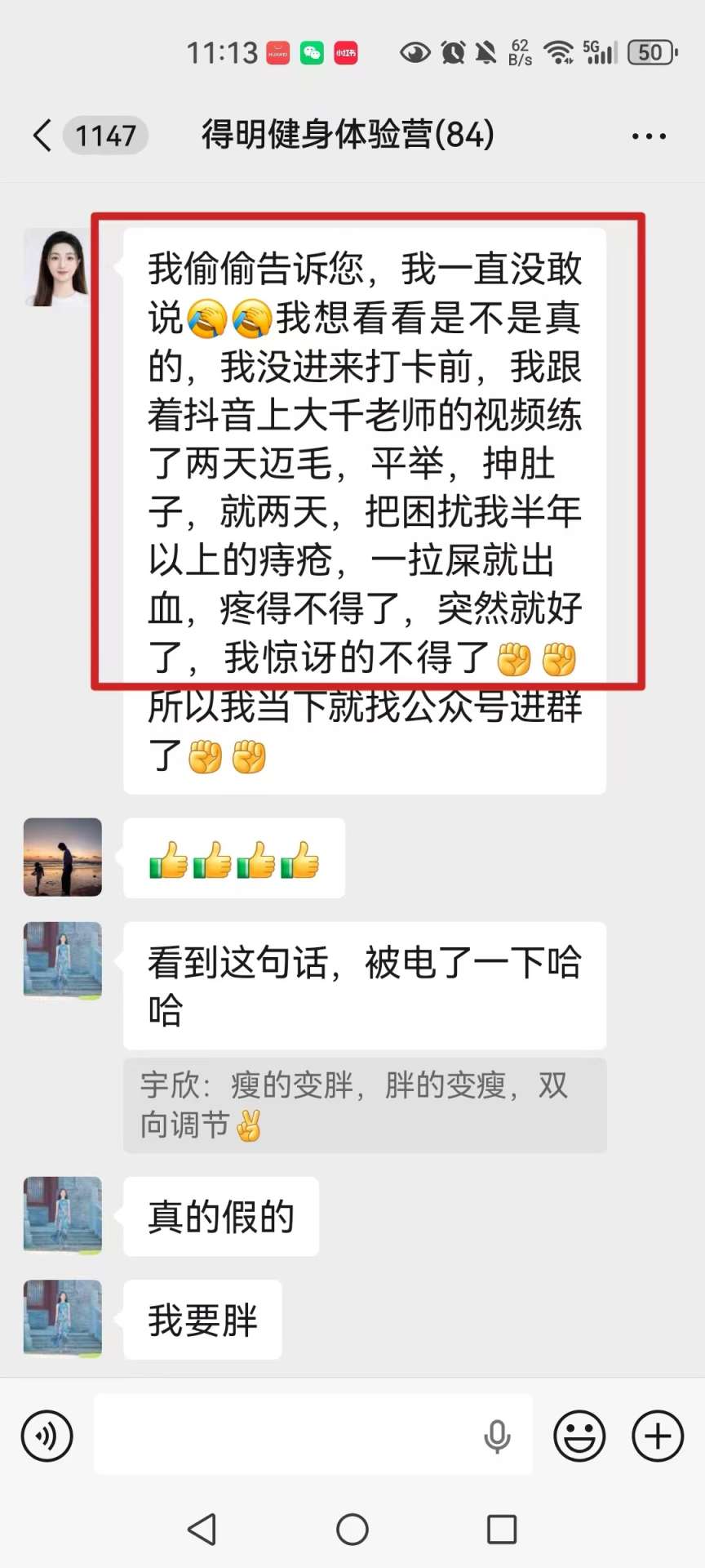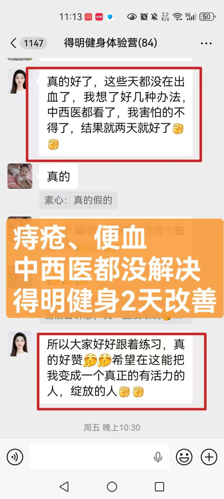 得明健身体验营学员分享:半年多前就开始被痔疮便血折磨,每次上厕所都像受刑一样疼。中西医都看了,药也用了不少,但便血和疼痛的问题就是反反复复,一点好转的迹象都没有。