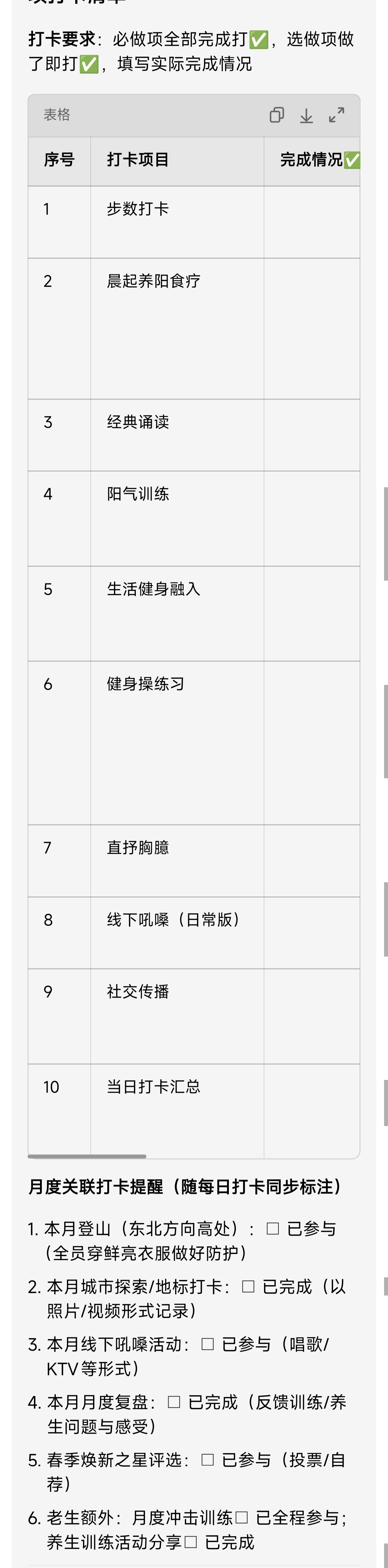 6. 老生额外:月度冲击训练□ 已全程参与;养生训练活动分享□ 已完成