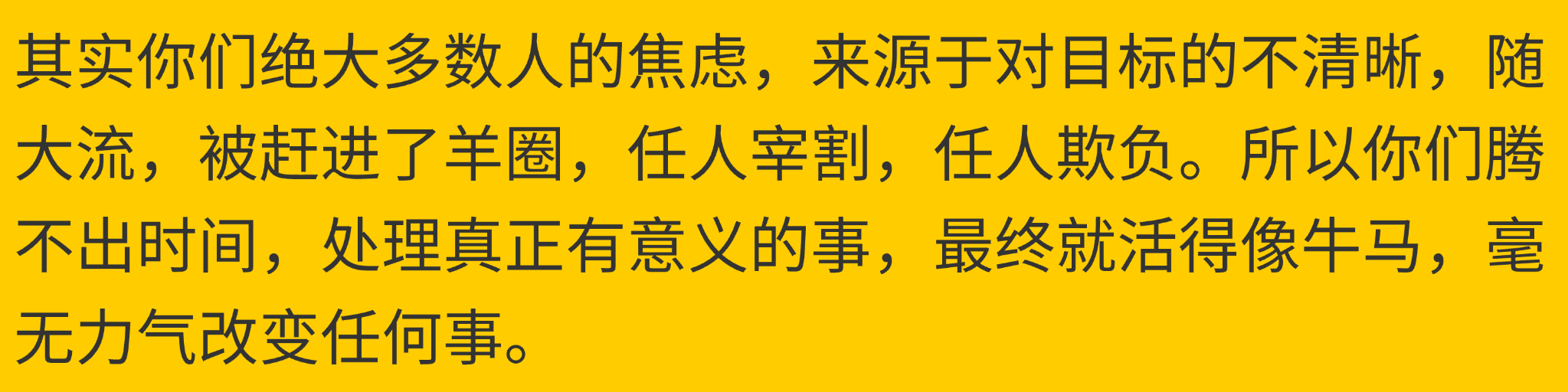 师:其实你们绝大多数人的焦虑,来源于对目标的不清晰,随大流,被赶进了羊圈,任人宰割,任人欺负,所以你们腾不出时间,处理真正有意义的事,最终就活得像牛马,毫无力气改变任何事。