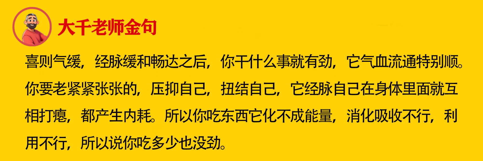 【大千老师金句】喜则气缓,经脉缓和畅达之后,你干什么事就有劲,它气血流通特别顺,你要老紧紧张张的,压抑自己,扭结自己,它经脉自己在身体里面就互相打瘪,都产生内耗,所以你吃东西它化不成能量,消化吸收不行,利用不行,所以说你吃多少也没劲。 https://dmjs.info/m/dv_topic/view.asp?id=12511514