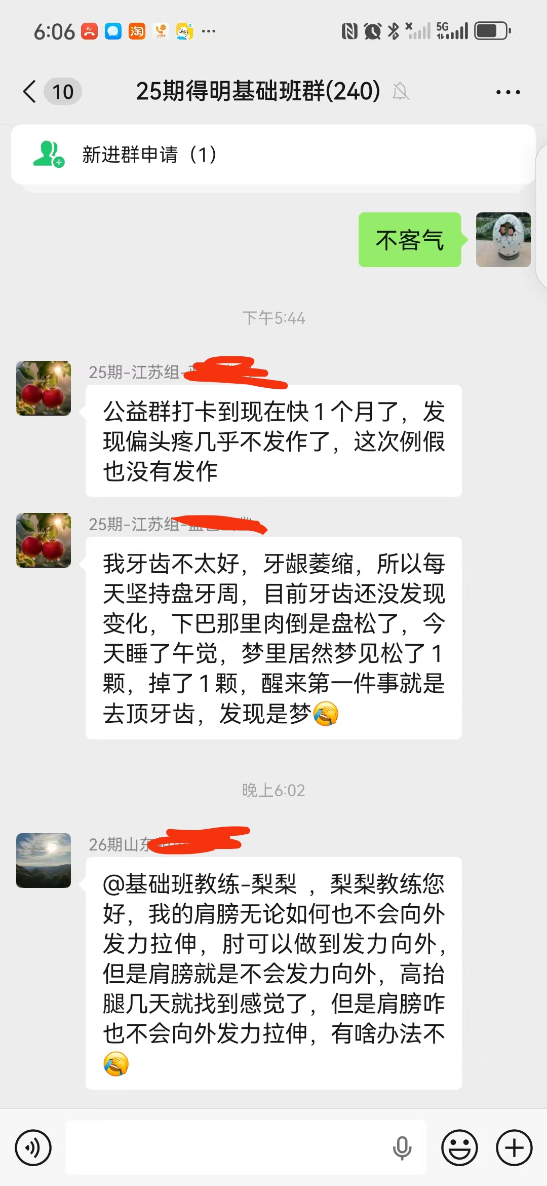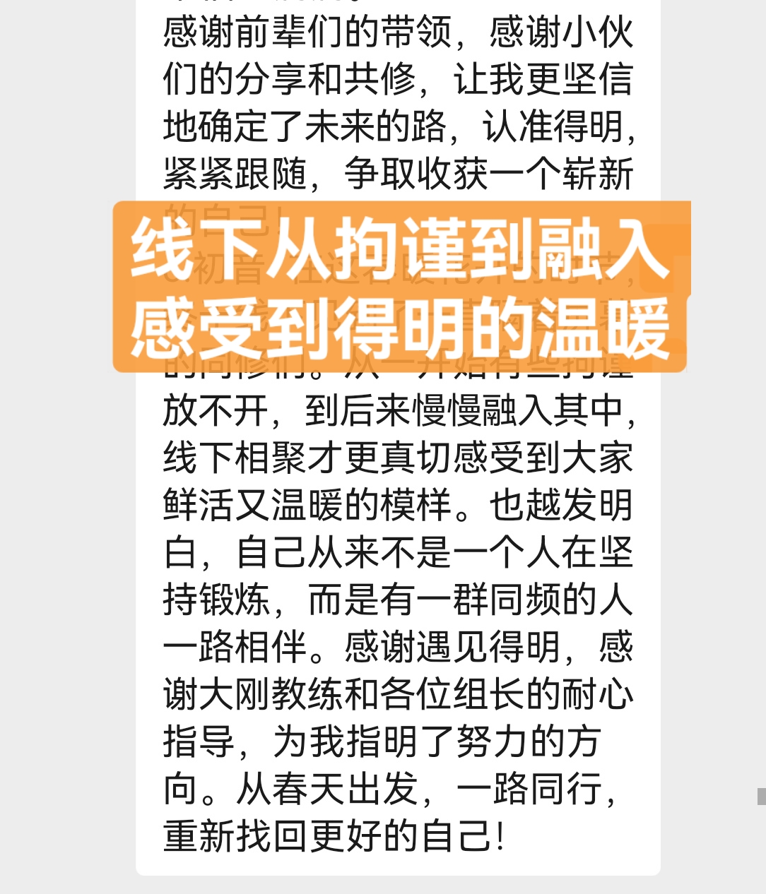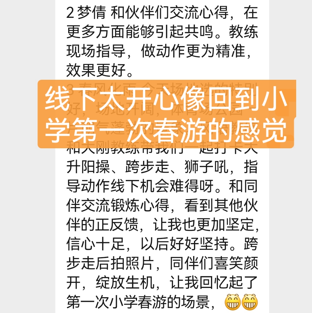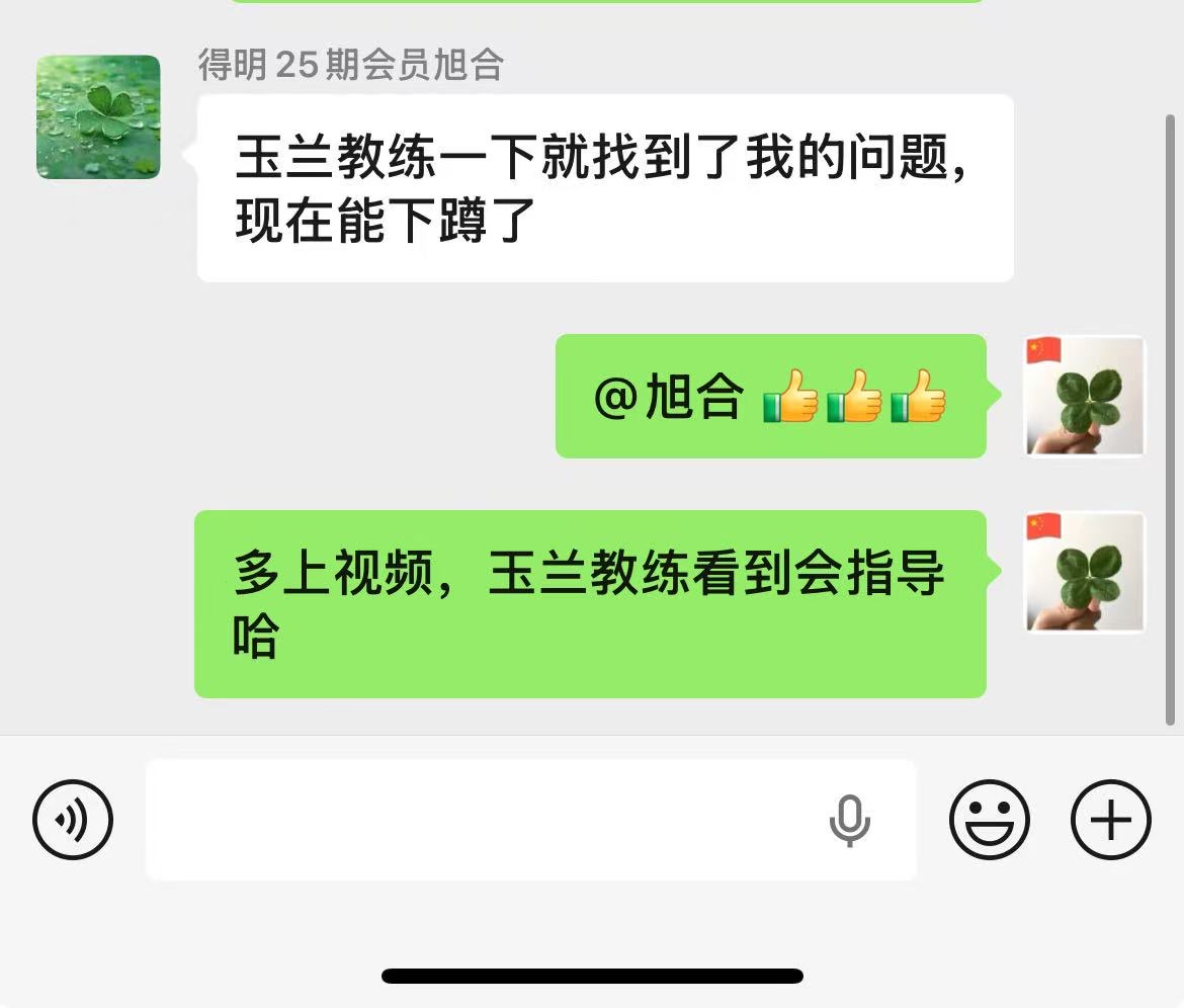 因为睡眠不好,年前就在网上看到迈毛对失眠有用,接触了得明,但想加入不知如何加入,后来随着浏览帖子多了找到了联系的微信,加入了得明健身群,开始平举高抬腿和迈毛打卡,开始做完了大腿根发木,后来胯发木,后来又学了老师的小升阳操,就开始不断的打嗝,现在一练还在打嗝,老师说打嗝有好多都是按年算的,一点也不假。我上面太堵了,练了小升阳操后肩膀舒服些了,腿也轻快点了,就加入了基础班,目前前前后后练了20天了,听大千老师的课很受启发,老师讲课也很吸引人,很风趣幽默,深入浅出不枯燥,很喜欢听老师的课。大千老师带操的时候就像上理论课,能讲清楚要点,跟练效果就很好。老师知识渊博,又很平易近人。老师的徒弟都很像他,真是有什么师傅就有什么徒弟,总之,得明这个大家庭很好,很温馨。我们的组长足下生老师也很负责很有耐心很专业。春春教练和许医师感觉都好厉害,讲的可好了。我以前大便不成形,现在成型了,鼻炎很严重,现在竟然也改善了,以前不觉得饿,现在竟然也会觉得饿了。我有好多习惯不太好,需要改,特别是晚上睡不着,睡的晚,早上起不来,耽误早饭,最想改善的是睡眠,目前还不行,还不觉得困,啥时候觉得困了可能就能睡着了。但跟着得明还是有信心的。病也不是一天得的,也不会一天就好了。还有胆结石,肺结节等,问题慢慢来吧,就每天尽可能抽时间练,就像老师说的,干就是了。得明健身不累,容易坚持,有时间就多练几遍,没时间就少练点,一遍两遍都行,找准了方向,和得明一路相随。