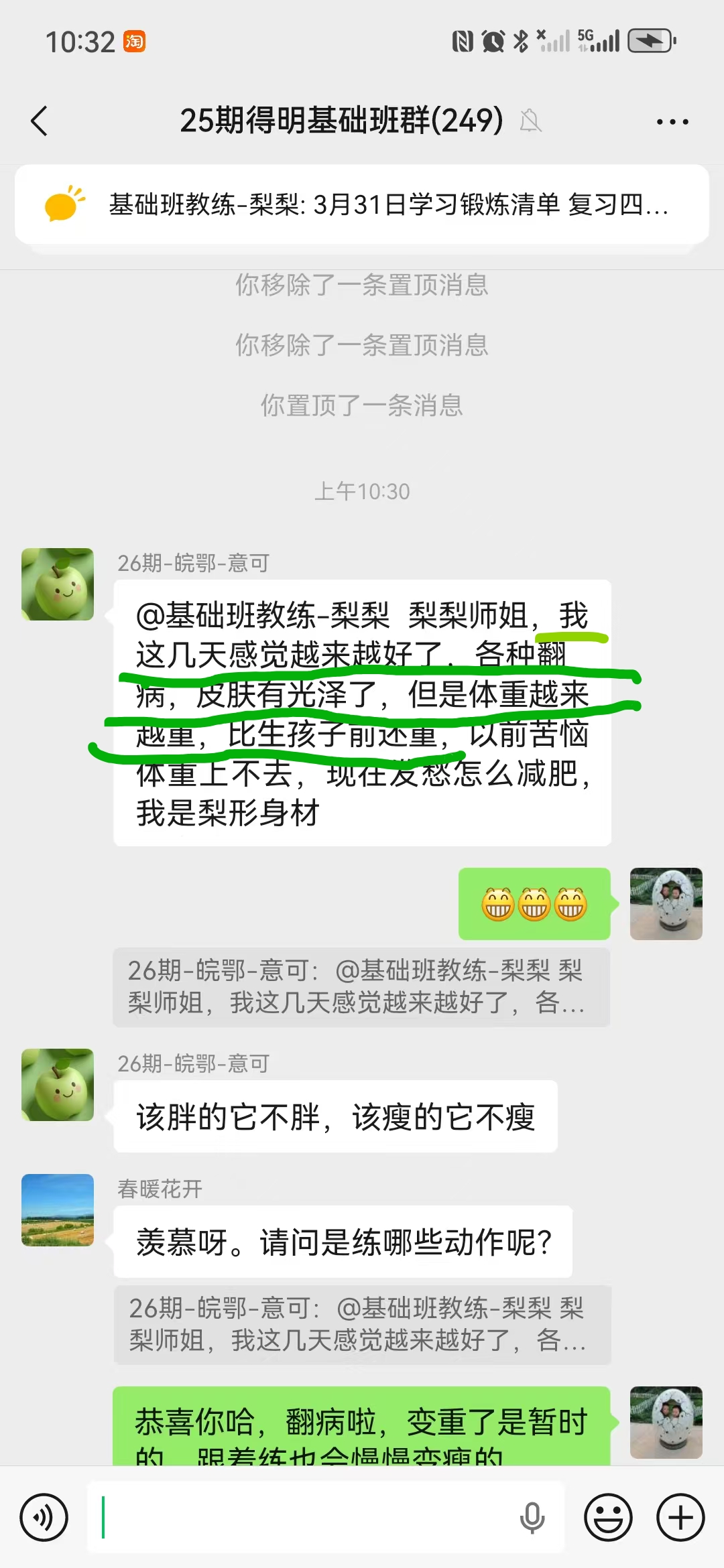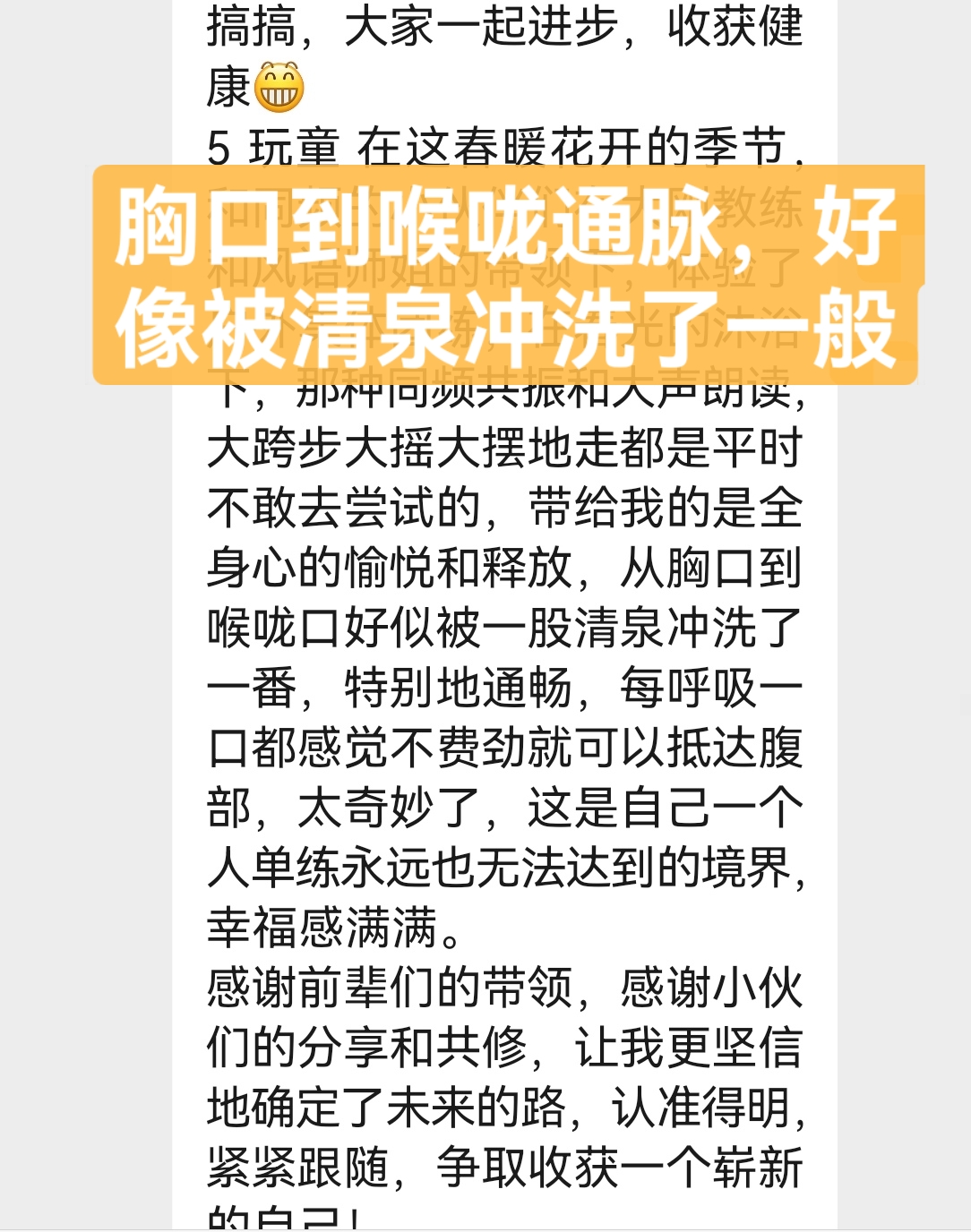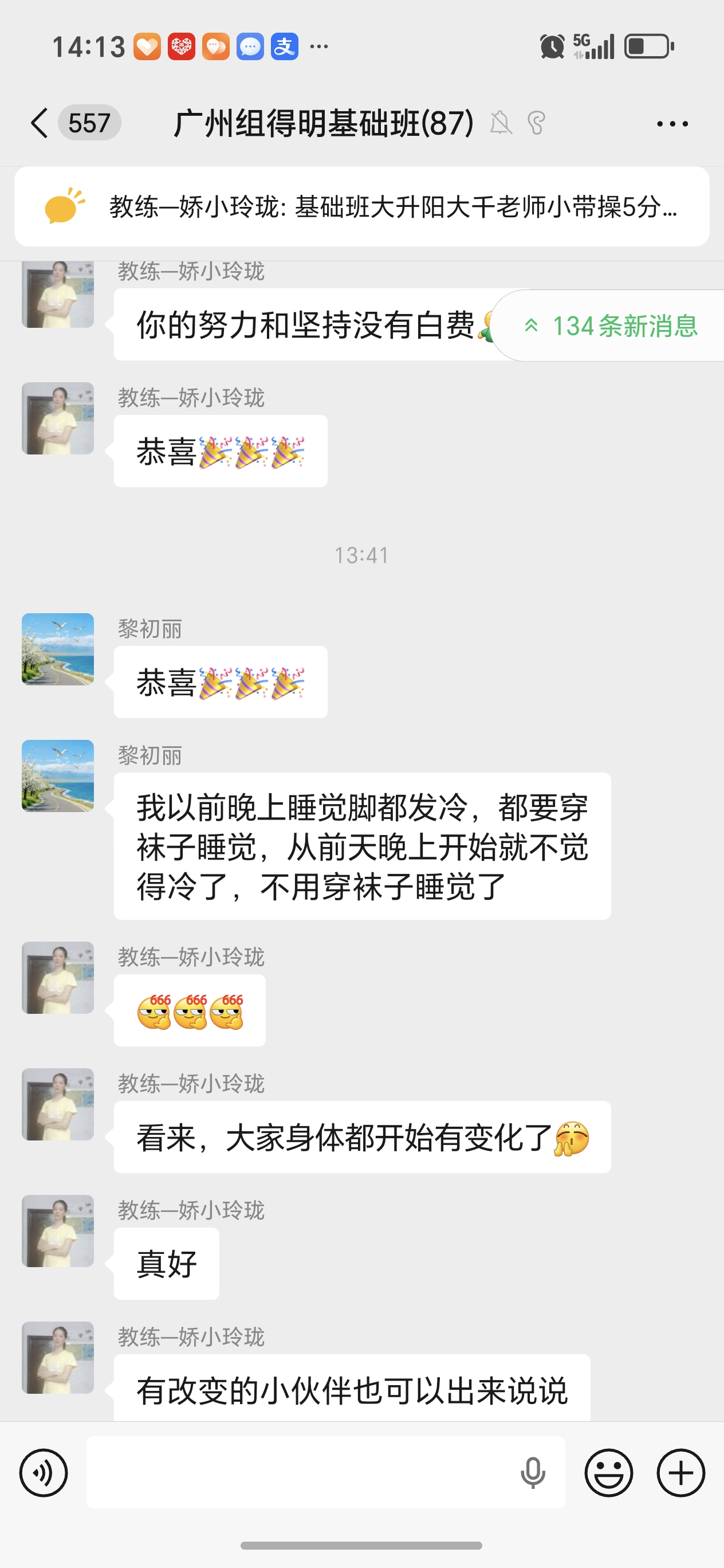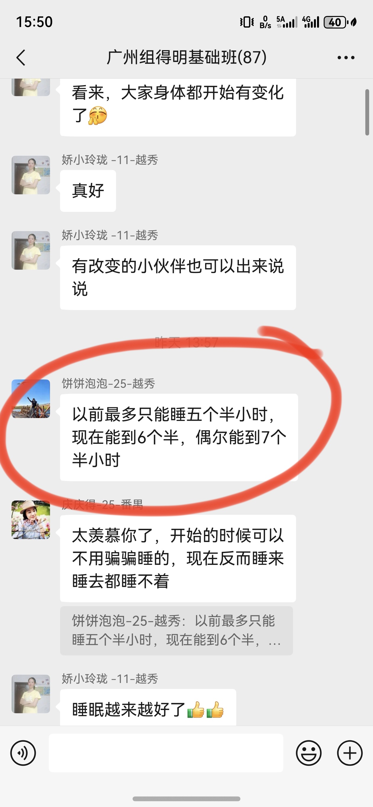 因为睡眠不好,年前就在网上看到迈毛对失眠有用,接触了得明,但想加入不知如何加入,后来随着浏览帖子多了找到了联系的微信,加入了得明健身群,开始平举高抬腿和迈毛打卡,开始做完了大腿根发木,后来胯发木,后来又学了老师的小升阳操,就开始不断的打嗝,现在一练还在打嗝,老师说打嗝有好多都是按年算的,一点也不假。我上面太堵了,练了小升阳操后肩膀舒服些了,腿也轻快点了,就加入了基础班,目前前前后后练了20天了,听大千老师的课很受启发,老师讲课也很吸引人,很风趣幽默,深入浅出不枯燥,很喜欢听老师的课。大千老师带操的时候就像上理论课,能讲清楚要点,跟练效果就很好。老师知识渊博,又很平易近人。老师的徒弟都很像他,真是有什么师傅就有什么徒弟,总之,得明这个大家庭很好,很温馨。我们的组长足下生老师也很负责很有耐心很专业。春春教练和许医师感觉都好厉害,讲的可好了。我以前大便不成形,现在成型了,鼻炎很严重,现在竟然也改善了,以前不觉得饿,现在竟然也会觉得饿了。我有好多习惯不太好,需要改,特别是晚上睡不着,睡的晚,早上起不来,耽误早饭,最想改善的是睡眠,目前还不行,还不觉得困,啥时候觉得困了可能就能睡着了。但跟着得明还是有信心的。病也不是一天得的,也不会一天就好了。还有胆结石,肺结节等,问题慢慢来吧,就每天尽可能抽时间练,就像老师说的,干就是了。得明健身不累,容易坚持,有时间就多练几遍,没时间就少练点,一遍两遍都行,找准了方向,和得明一路相随。