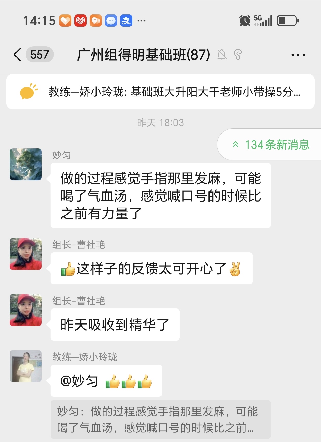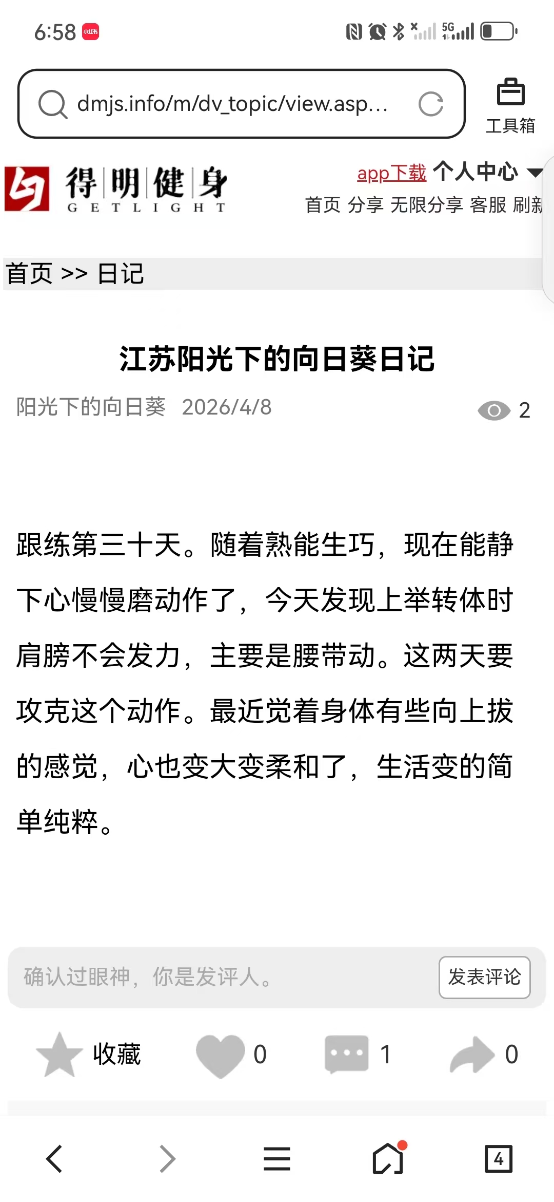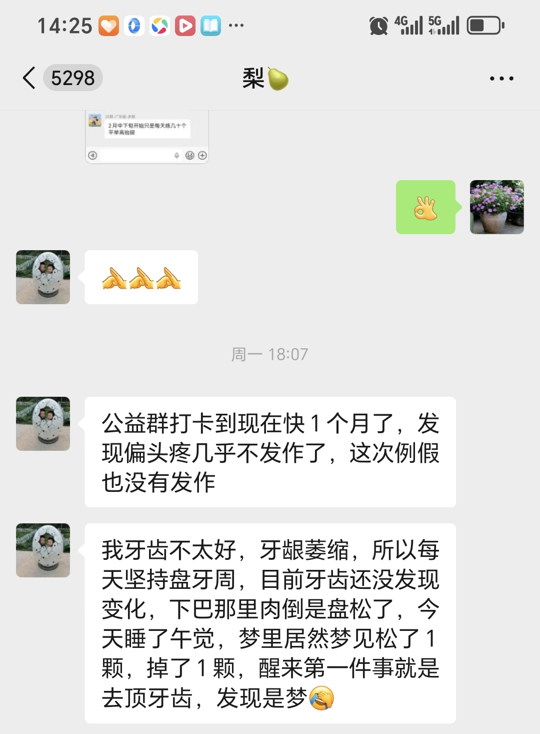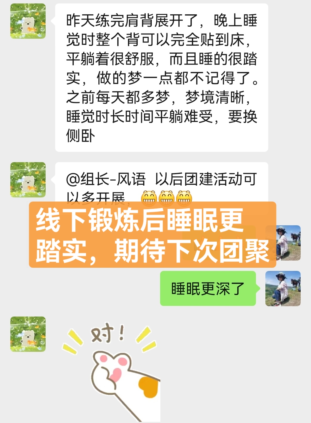 因为睡眠不好,年前就在网上看到迈毛对失眠有用,接触了得明,但想加入不知如何加入,后来随着浏览帖子多了找到了联系的微信,加入了得明健身群,开始平举高抬腿和迈毛打卡,开始做完了大腿根发木,后来胯发木,后来又学了老师的小升阳操,就开始不断的打嗝,现在一练还在打嗝,老师说打嗝有好多都是按年算的,一点也不假。我上面太堵了,练了小升阳操后肩膀舒服些了,腿也轻快点了,就加入了基础班,目前前前后后练了20天了,听大千老师的课很受启发,老师讲课也很吸引人,很风趣幽默,深入浅出不枯燥,很喜欢听老师的课。大千老师带操的时候就像上理论课,能讲清楚要点,跟练效果就很好。老师知识渊博,又很平易近人。老师的徒弟都很像他,真是有什么师傅就有什么徒弟,总之,得明这个大家庭很好,很温馨。我们的组长足下生老师也很负责很有耐心很专业。春春教练和许医师感觉都好厉害,讲的可好了。我以前大便不成形,现在成型了,鼻炎很严重,现在竟然也改善了,以前不觉得饿,现在竟然也会觉得饿了。我有好多习惯不太好,需要改,特别是晚上睡不着,睡的晚,早上起不来,耽误早饭,最想改善的是睡眠,目前还不行,还不觉得困,啥时候觉得困了可能就能睡着了。但跟着得明还是有信心的。病也不是一天得的,也不会一天就好了。还有胆结石,肺结节等,问题慢慢来吧,就每天尽可能抽时间练,就像老师说的,干就是了。得明健身不累,容易坚持,有时间就多练几遍,没时间就少练点,一遍两遍都行,找准了方向,和得明一路相随。