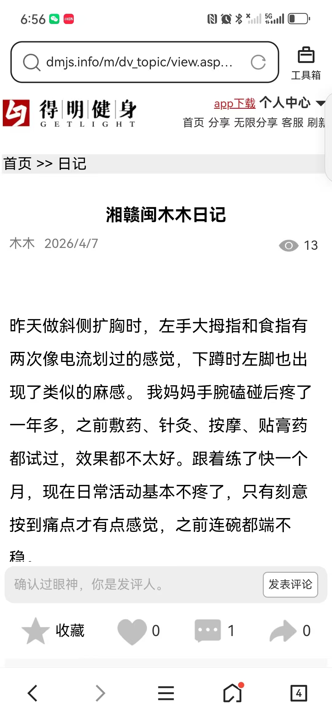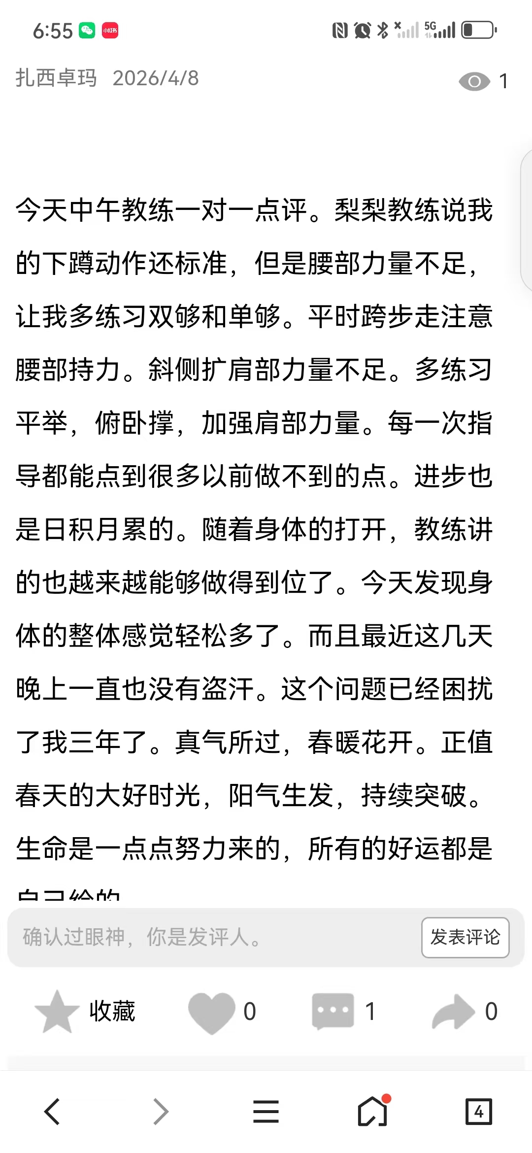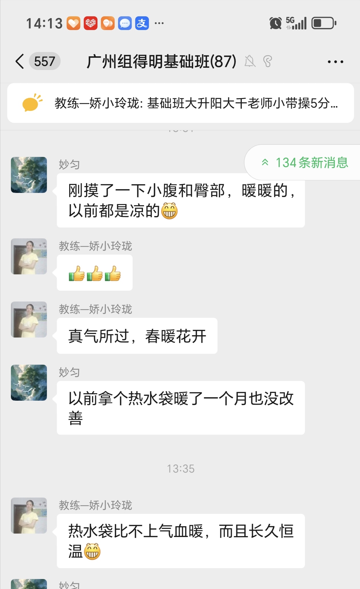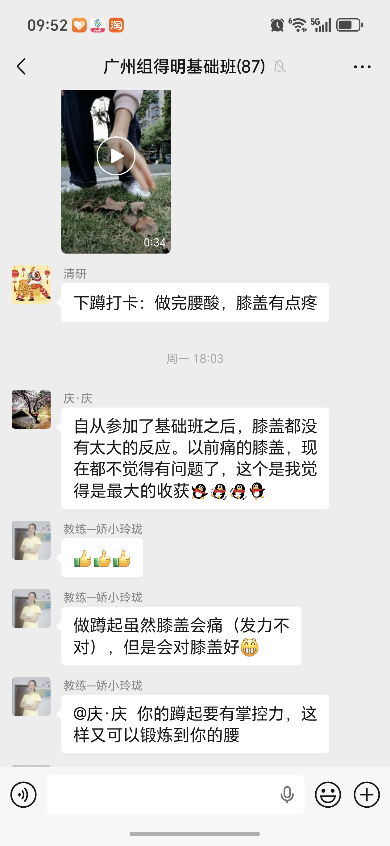 因为睡眠不好,年前就在网上看到迈毛对失眠有用,接触了得明,但想加入不知如何加入,后来随着浏览帖子多了找到了联系的微信,加入了得明健身群,开始平举高抬腿和迈毛打卡,开始做完了大腿根发木,后来胯发木,后来又学了老师的小升阳操,就开始不断的打嗝,现在一练还在打嗝,老师说打嗝有好多都是按年算的,一点也不假。我上面太堵了,练了小升阳操后肩膀舒服些了,腿也轻快点了,就加入了基础班,目前前前后后练了20天了,听大千老师的课很受启发,老师讲课也很吸引人,很风趣幽默,深入浅出不枯燥,很喜欢听老师的课。大千老师带操的时候就像上理论课,能讲清楚要点,跟练效果就很好。老师知识渊博,又很平易近人。老师的徒弟都很像他,真是有什么师傅就有什么徒弟,总之,得明这个大家庭很好,很温馨。我们的组长足下生老师也很负责很有耐心很专业。春春教练和许医师感觉都好厉害,讲的可好了。我以前大便不成形,现在成型了,鼻炎很严重,现在竟然也改善了,以前不觉得饿,现在竟然也会觉得饿了。我有好多习惯不太好,需要改,特别是晚上睡不着,睡的晚,早上起不来,耽误早饭,最想改善的是睡眠,目前还不行,还不觉得困,啥时候觉得困了可能就能睡着了。但跟着得明还是有信心的。病也不是一天得的,也不会一天就好了。还有胆结石,肺结节等,问题慢慢来吧,就每天尽可能抽时间练,就像老师说的,干就是了。得明健身不累,容易坚持,有时间就多练几遍,没时间就少练点,一遍两遍都行,找准了方向,和得明一路相随。