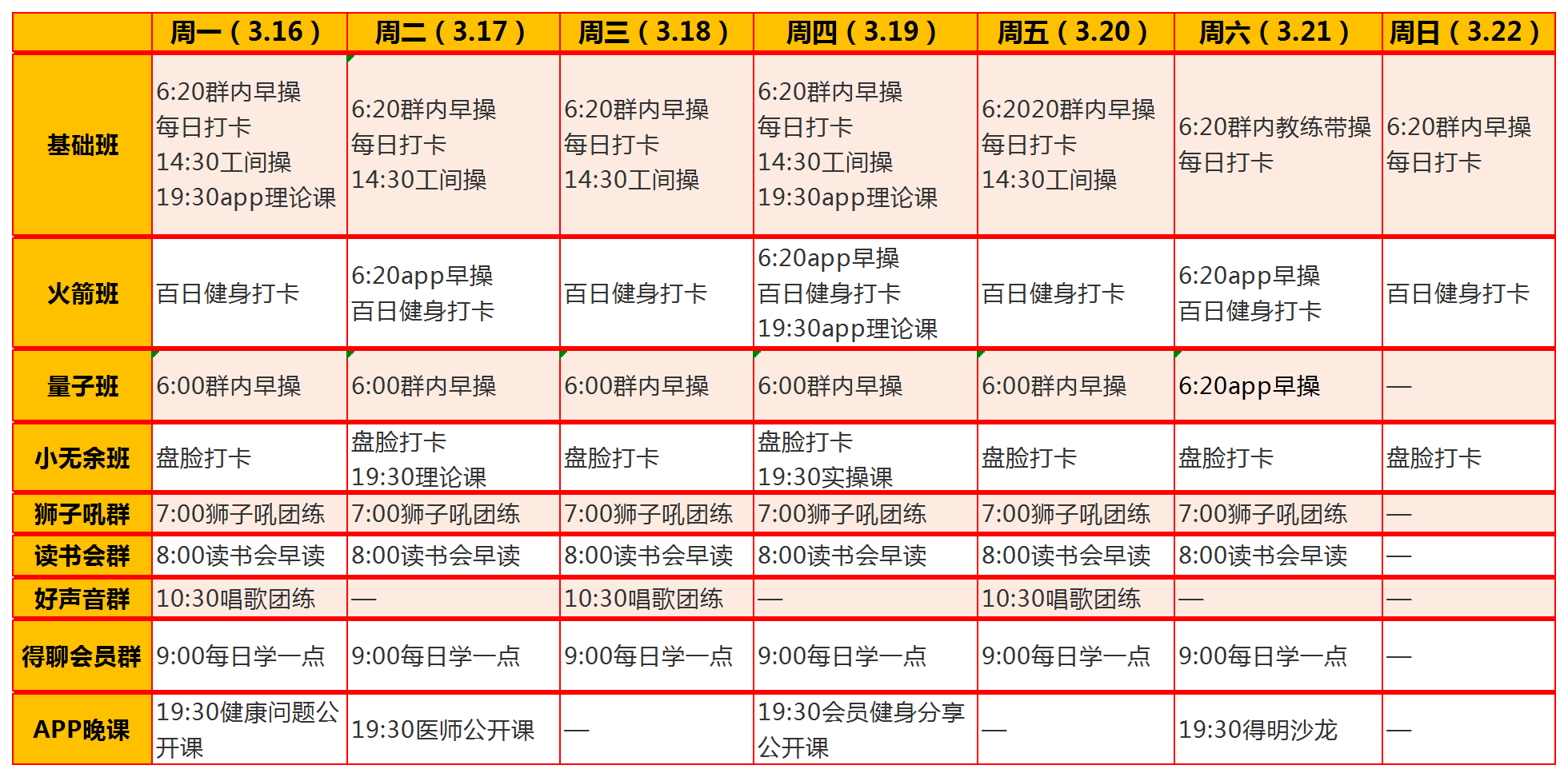⏰06:20 基础班/火箭班早操 📍基础班群/得明健身APP