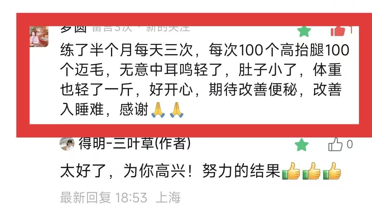练了半个月每天三次,每次100个高抬腿100个迈毛,无意中耳鸣轻了,肚子小了,体重也轻了一斤,好开心,期待改善便秘,改善入睡难,感谢!