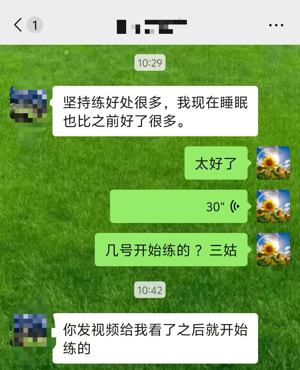 坚持练好处很多,我现在睡眠也比之前好了很多。你发视频给我看了之后就开始练的