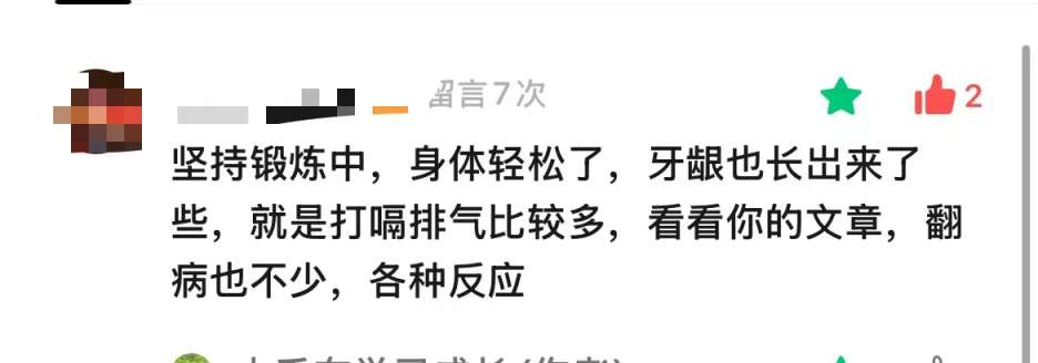 坚持锻炼中,身体轻松了,牙龈也长出来了些,就是打嗝排气比较多,看看你的文章,翻病也不少,各种反应