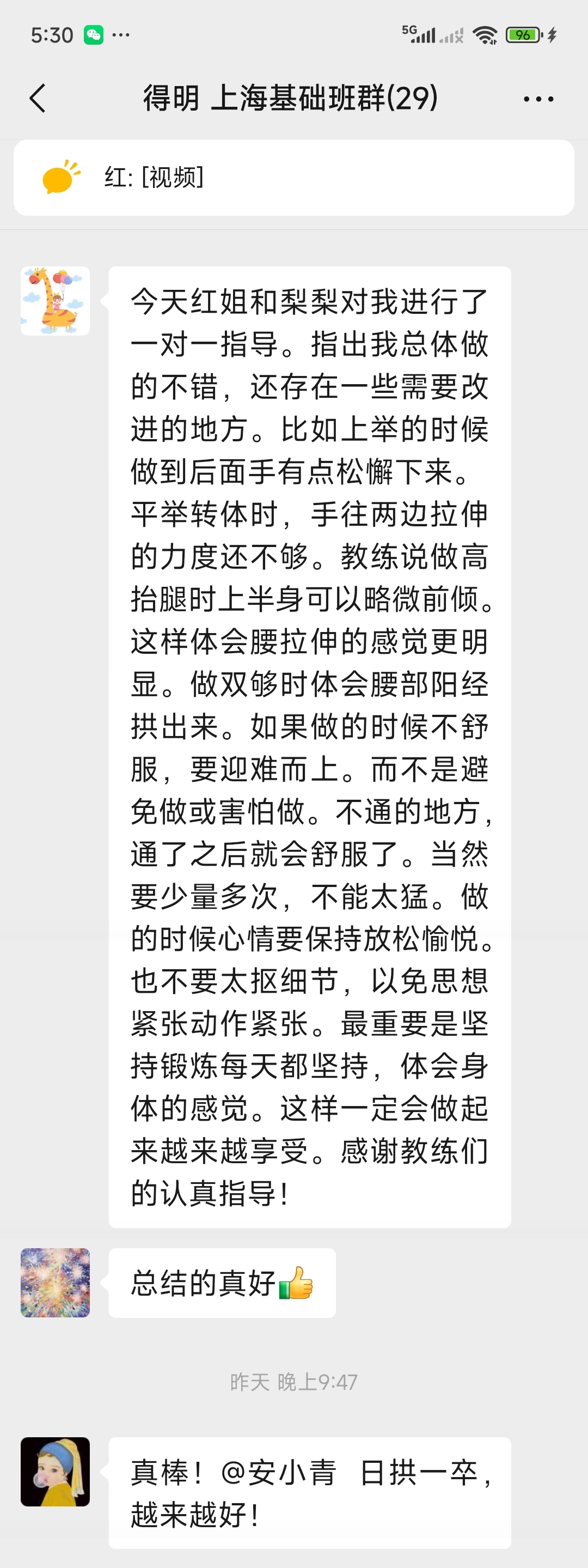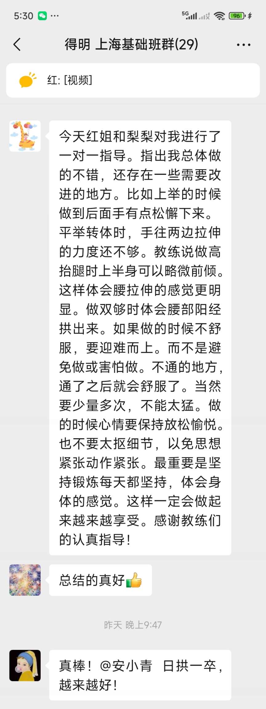 今天红姐和梨梨对我进行了一对一指导。指出我总体做的不错,还存在一些需要改进的地方。比如上举的时候做到后面手有点松懈下来。平举转体时,手往两边拉伸的力度还不够。教练说做高抬腿时上半身可以略微前倾。这样体会腰拉伸的感觉更明显。做双够时体会腰部阳经拱出来。如果做的时候不舒服,要迎难而上。而不是避免做或害怕做。不通的地方,通了之后就会舒服了。当然要少量多次,不能太猛。做的时候心情要保持放松愉悦。也不要太抠细节,以免思想紧张动作紧张。最重要是坚持锻炼每天都坚持,体会身体的感觉。这样一定会做起来越来越享受。感谢教练们的认真指导!