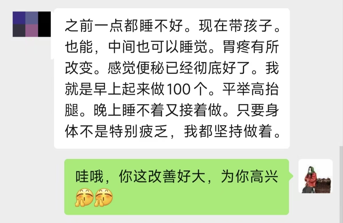 之前一点都睡不好。现在带孩子。也能,中间也可以睡觉。胃疼有所改变。感觉便秘已经彻底好了。我就是早上起来做100个。平举高抬腿。晚上睡不着又接着做。只要身体不是特别疲乏,我都坚持做着。