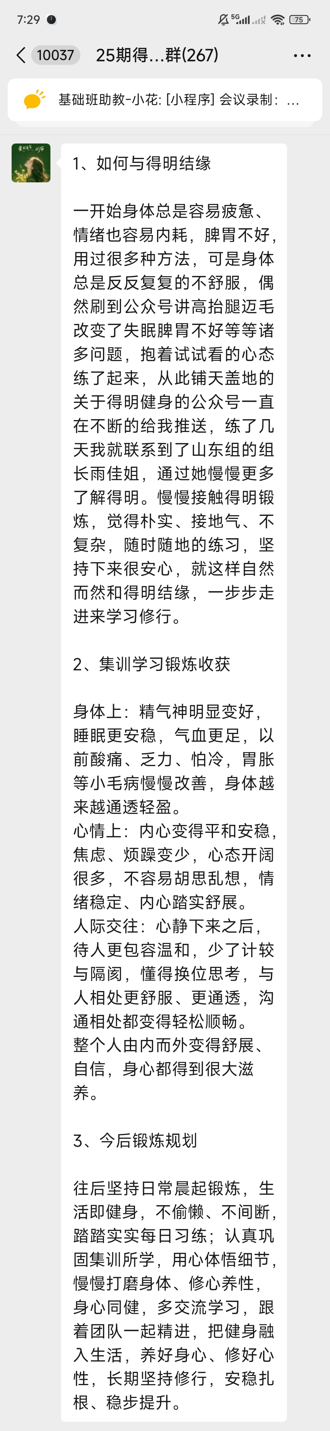一开始身体总是容易疲惫、情绪也容易内耗,脾胃不好,用过很多种方法,可是身体总是反反复复的不舒服,偶然刷到公众号讲高抬腿迈毛改变了失眠脾胃不好等等诸多问题,抱着试试看的心态练了起来,从此铺天盖地的关于得明健身的公众号一直在不断的给我推送,练了几天我就联系到了山东组的组长雨佳姐,通过她慢慢更多了解得明。慢慢接触得明锻炼,觉得朴实、接地气、不复杂,随时随地的练习,坚持下来很安心,就这样自然而然和得明结缘,一步步走进来学习修行。