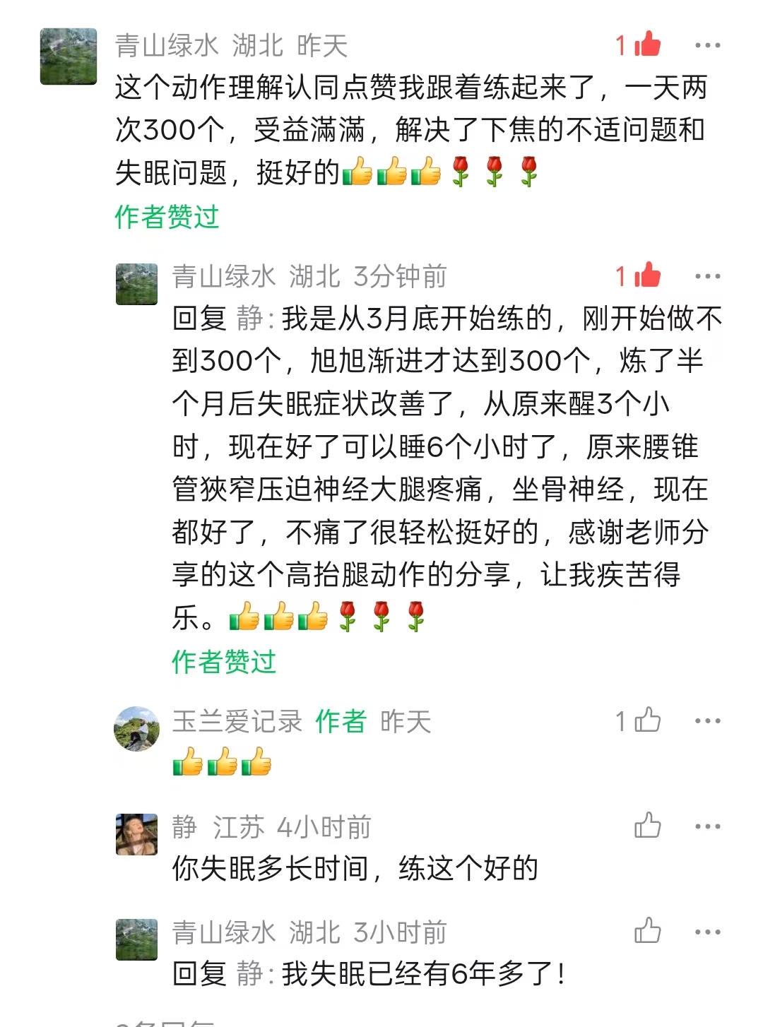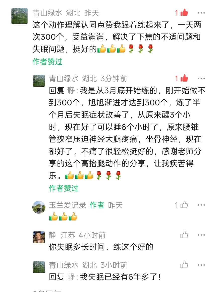 我是从3月底开始练的,刚开始做不到300个,循序渐进才达到300个,练了半个月后失眠症状改善了,从原来醒3个小时,现在好了可以睡6个小时了,原来腰锥管狹窄压迫神经大腿疼痛,坐骨神经,现在都好了,不痛了很轻松挺好的,感谢老师分享的这个高抬腿动作的分享,让我疾苦得乐。