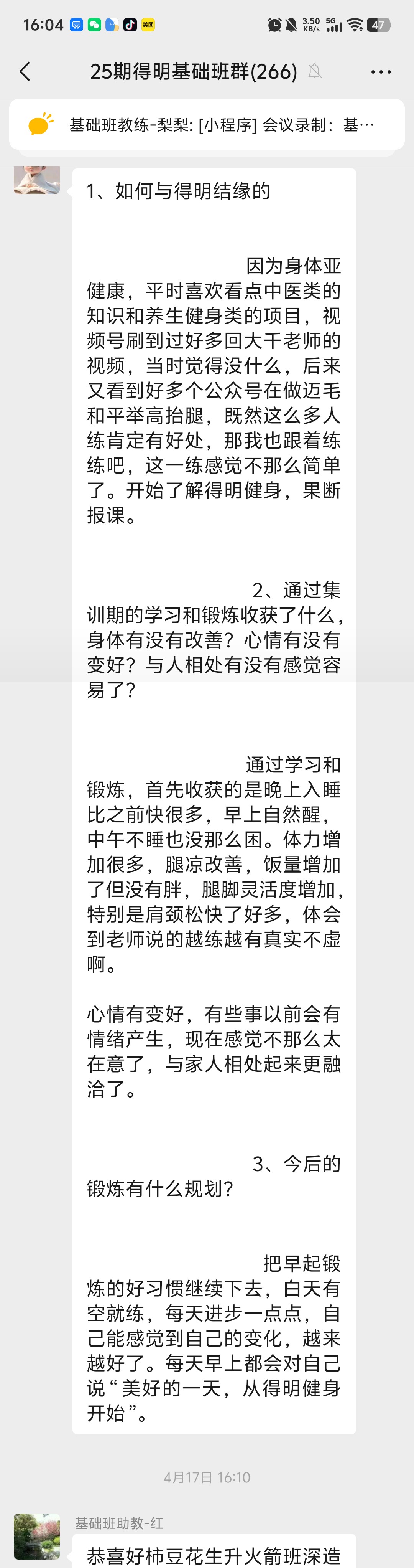 因为身体亚健康,平时喜欢看点中医类的知识和养生健身类的项目,视频号刷到过好多回大千老师的视频,当时觉得没什么,后来又看到好多个公众号在做迈毛和平举高抬腿,既然这么多人练肯定有好处,那我也跟着练练吧,这一练感觉不那么简单了。开始了解得明健身,果断报课。
