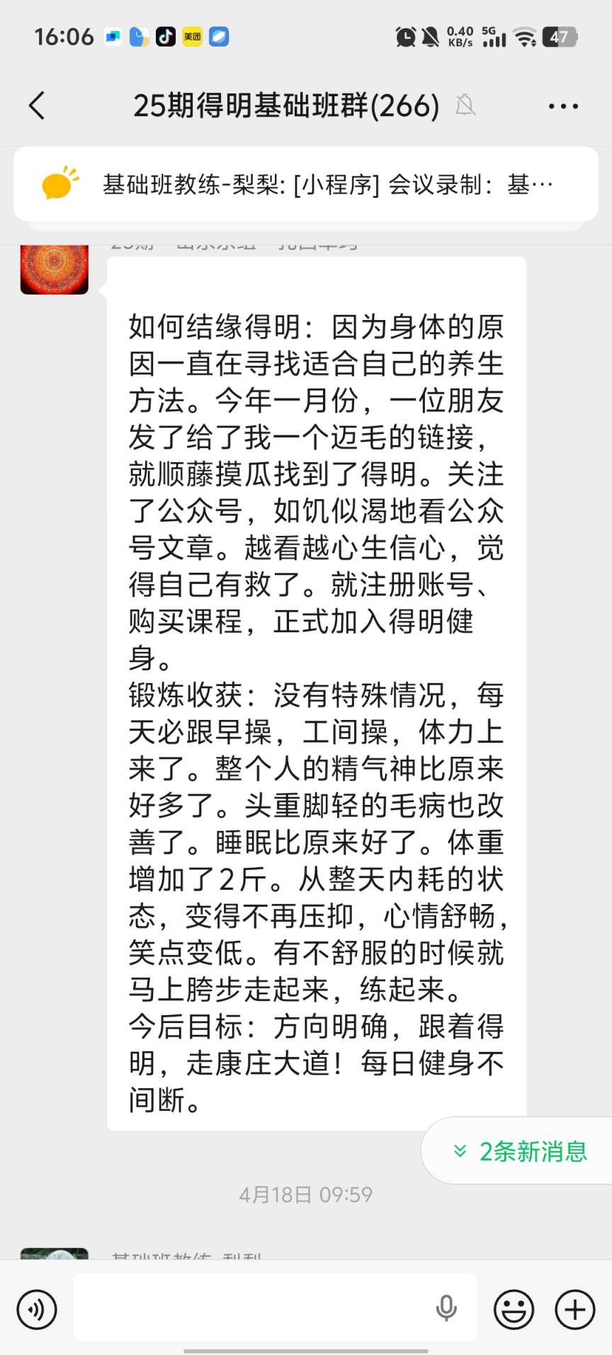 如何结缘得明:因为身体的原因一直在寻找适合自己的养生方法。今年一月份,一位朋友发了给了我一个迈毛的链接,就顺藤摸瓜找到了得明。关注了公众号,如饥似渴地看公众号文章。越看越心生信心,觉得自己有救了。就注册账号、购买课程,正式加入得明健身。