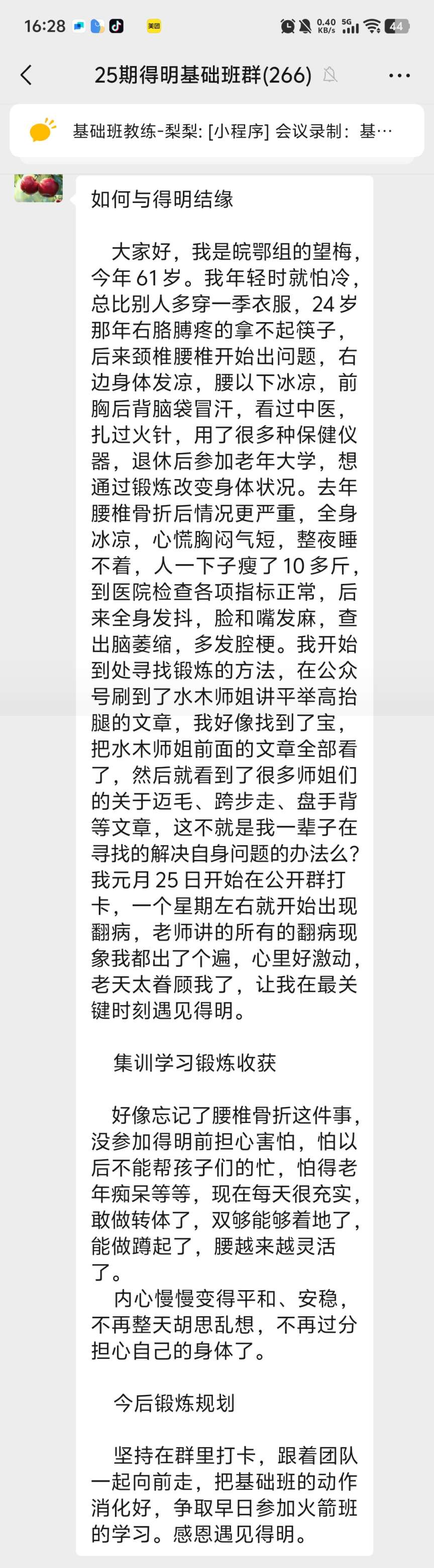 大家好,我是皖鄂组的望梅,今年61岁。我年轻时就怕冷,总比别人多穿一季衣服,24岁那年右胳膊疼的拿不起筷子,后来颈椎腰椎开始出问题,右边身体发凉,腰以下冰凉,前胸后背脑袋冒汗,看过中医,扎过火针,用了很多种保健仪器,退休后参加老年大学,想通过锻炼改变身体状况。去年腰椎骨折后情况更严重,全身冰凉,心慌胸闷气短,整夜睡不着,人一下子瘦了10多斤,到医院检查各项指标正常,后来全身发抖,脸和嘴发麻,查出脑萎缩,多发腔梗。我开始到处寻找锻炼的方法,在公众号刷到了水木师姐讲平举高抬腿的文章,我好像找到了宝,把水木师姐前面的文章全部看了,然后就看到了很多师姐们的关于迈毛、跨步走、盘手背等文章,这不就是我一辈子在寻找的解决自身问题的办法么?我元月25日开始在公开群打卡,一个星期左右就开始出现翻病,老师讲的所有的翻病现象我都出了个遍,心里好激动,老天太眷顾我了,让我在最关键时刻遇见得明。