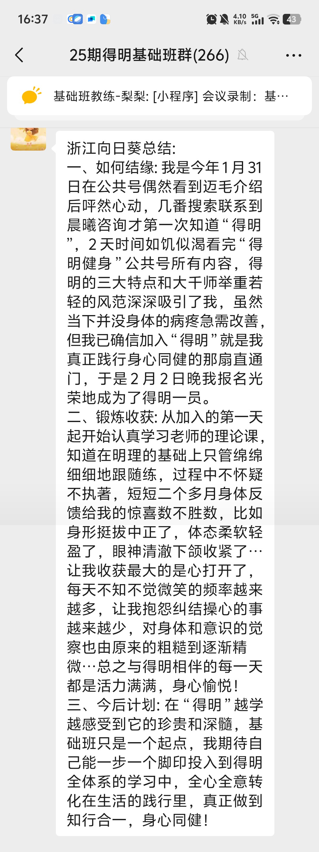 一、如何结缘: 我是今年1月31日在公共号偶然看到迈毛介绍后呯然心动,几番搜索联系到晨曦咨询才第一次知道“得明”,2天时间如饥似渴看完“得明健身”公共号所有内容,得明的三大特点和大千师举重若轻的风范深深吸引了我,虽然当下并没身体的病疼急需改善,但我已确信加入“得明”就是我真正践行身心同健的那扇直通门,于是2月2日晚我报名光荣地成为了得明一员。