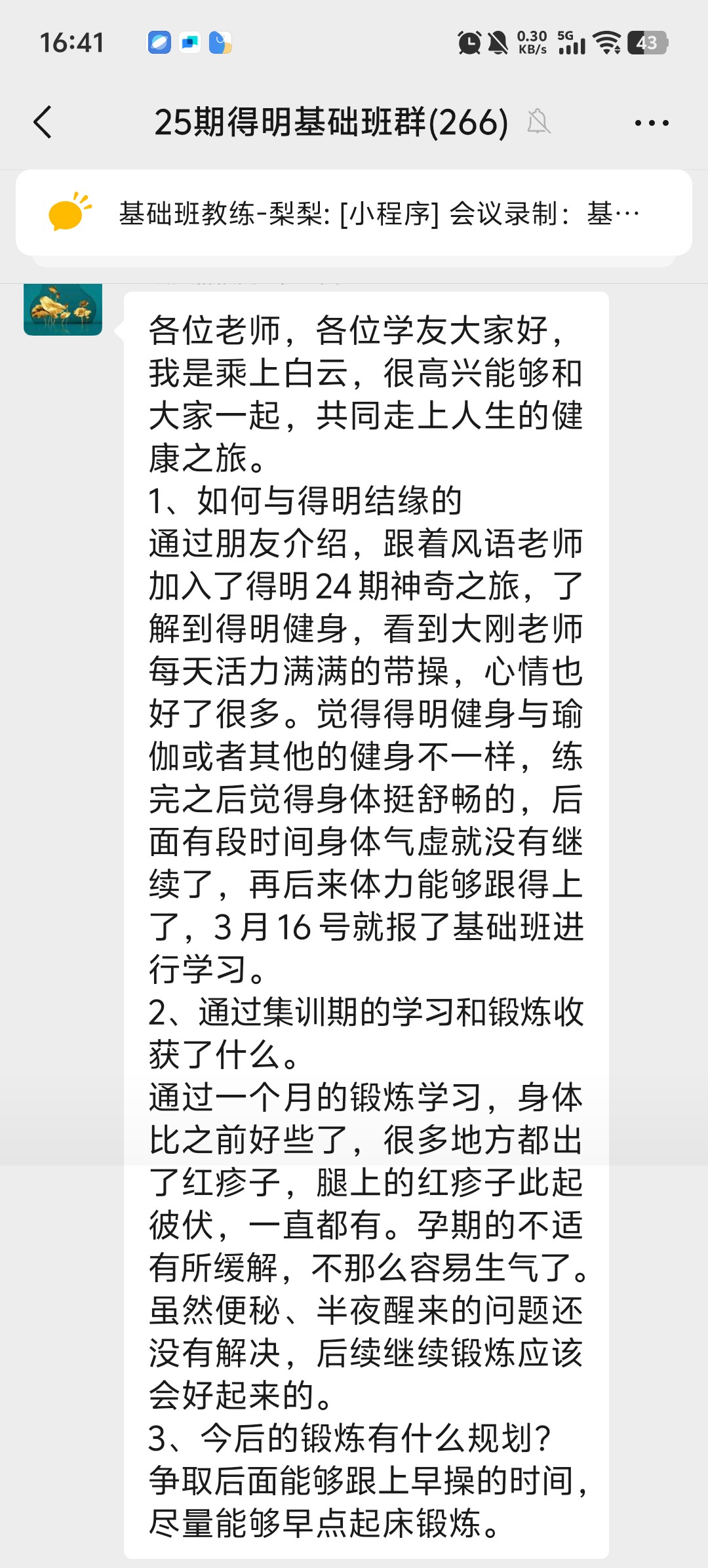 通过朋友介绍,跟着风语老师加入了得明24期神奇之旅,了解到得明健身,看到大刚老师每天活力满满的带操,心情也好了很多。觉得得明健身与瑜伽或者其他的健身不一样,练完之后觉得身体挺舒畅的,后面有段时间身体气虚就没有继续了,再后来体力能够跟得上了,3月16号就报了基础班进行学习。