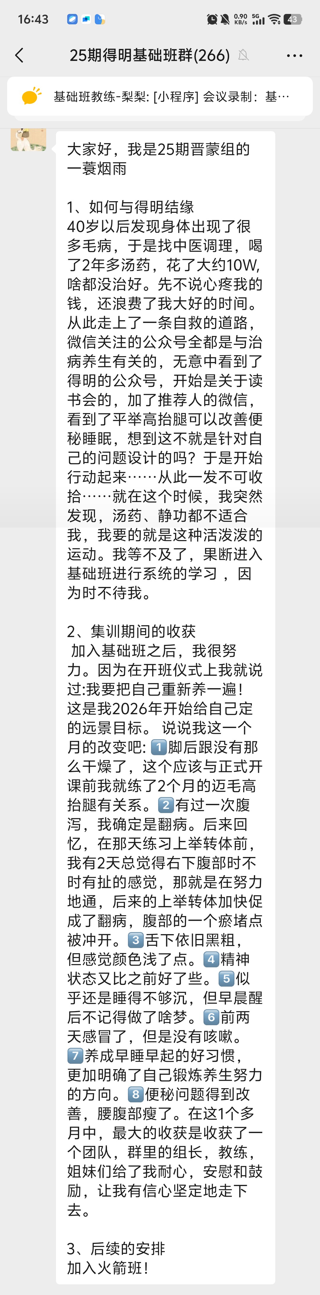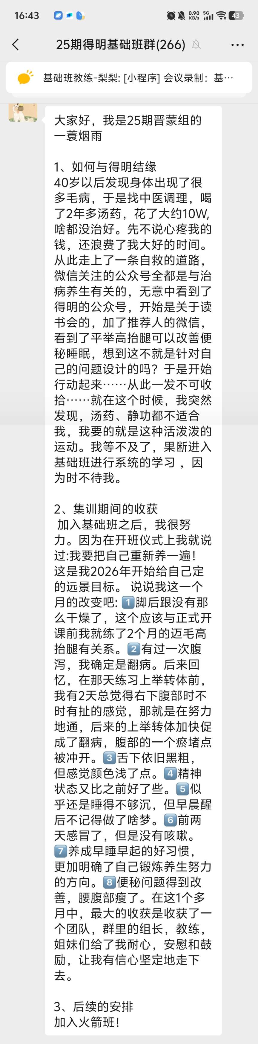 40岁以后发现身体出现了很多毛病,于是找中医调理,喝了2年多汤药,花了大约10W,啥都没治好。先不说心疼我的钱,还浪费了我大好的时间。从此走上了一条自救的道路,微信关注的公众号全都是与治病养生有关的,无意中看到了得明的公众号,开始是关于读书会的,加了推荐人的微信,看到了平举高抬腿可以改善便秘睡眠,想到这不就是针对自己的问题设计的吗?于是开始行动起来……从此一发不可收拾……就在这个时候,我突然发现,汤药、静功都不适合我,我要的就是这种活泼泼的运动。我等不及了,果断进入基础班进行系统的学习 ,因为时不待我。