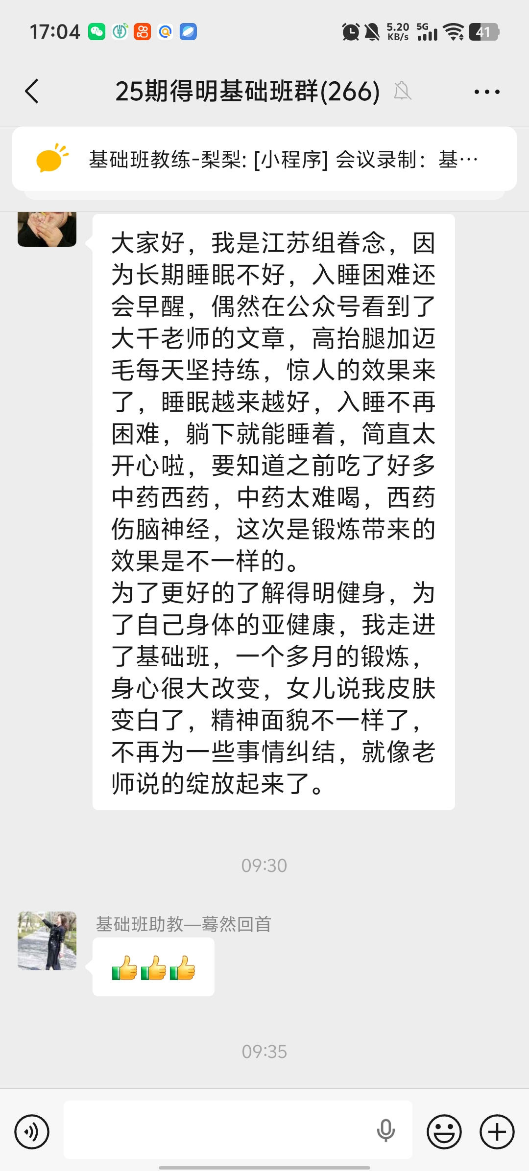 25期基础班分享,中年身体问题花费10W,无济于事,遇见得明,开始转变!早睡早起锻炼了,脚嫰了,便秘好了,腹部淤堵打通了,精气神好多了!腰腹部瘦了!继续火箭班锻炼!得樱