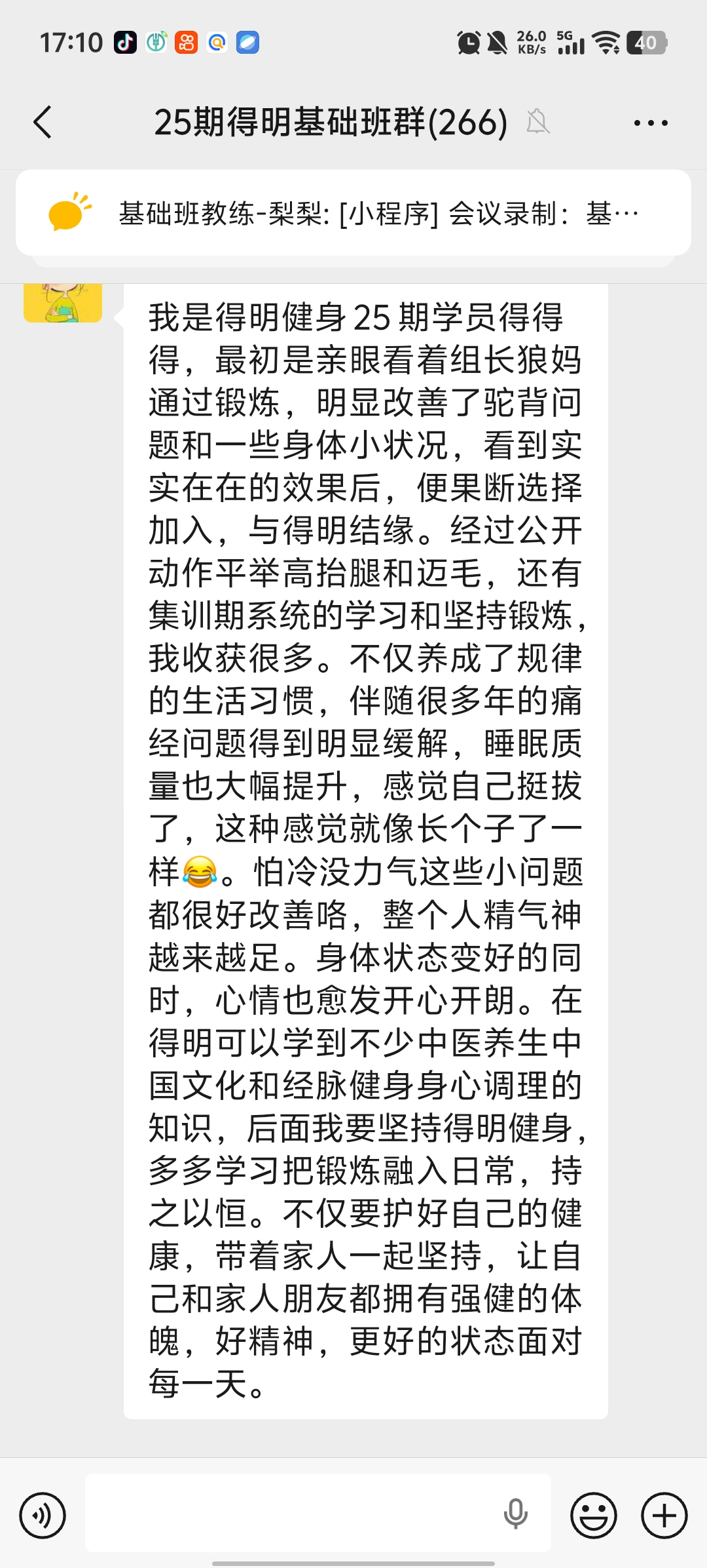 我是得明健身25期学员得得得,最初是亲眼看着组长狼妈通过锻炼,明显改善了驼背问题和一些身体小状况,看到实实在在的效果后,便果断选择加入,与得明结缘。经过公开动作平举高抬腿和迈毛,还有集训期系统的学习和坚持锻炼,我收获很多。不仅养成了规律的生活习惯,伴随很多年的痛经问题得到明显缓解,睡眠质量也大幅提升,感觉自己挺拔了,这种感觉就像长个子了一样😂。怕冷没力气这些小问题都很好改善咯,整个人精气神越来越足。身体状态变好的同时,心情也愈发开心开朗。在得明可以学到不少中医养生中国文化和经脉健身身心调理的知识,后面我要坚持得明健身,多多学习把锻炼融入日常,持之以恒。不仅要护好自己的健康,带着家人一起坚持,让自己和家人朋友都拥有强健的体魄,好精神,更好的状态面对每一天。
