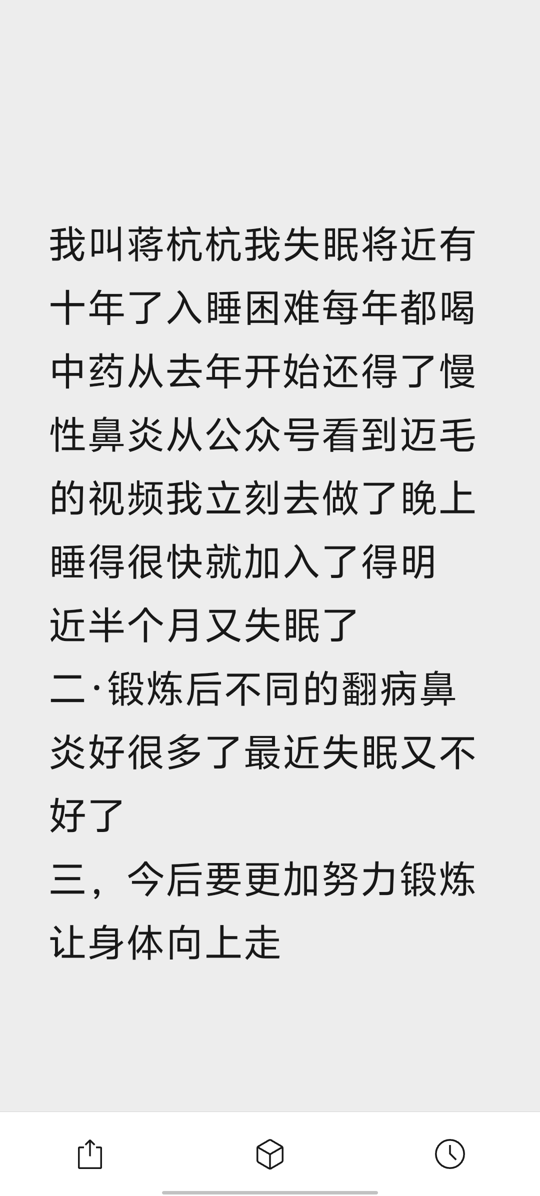 我叫蒋杭杭我失眠将近有十年了入睡困难每年都喝中药从去年开始还得了慢性鼻炎从公众号看到迈毛的视频我立刻去做了睌上睡得很快就加入了得明