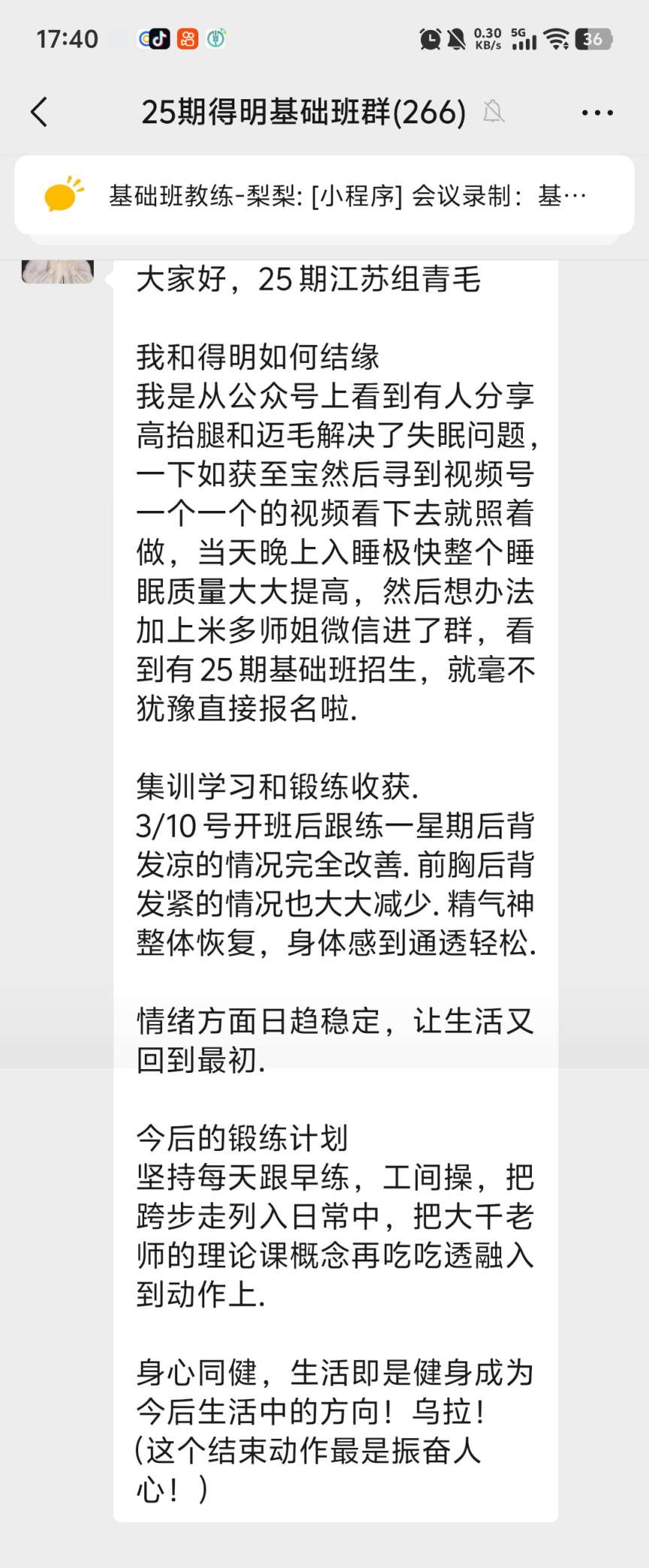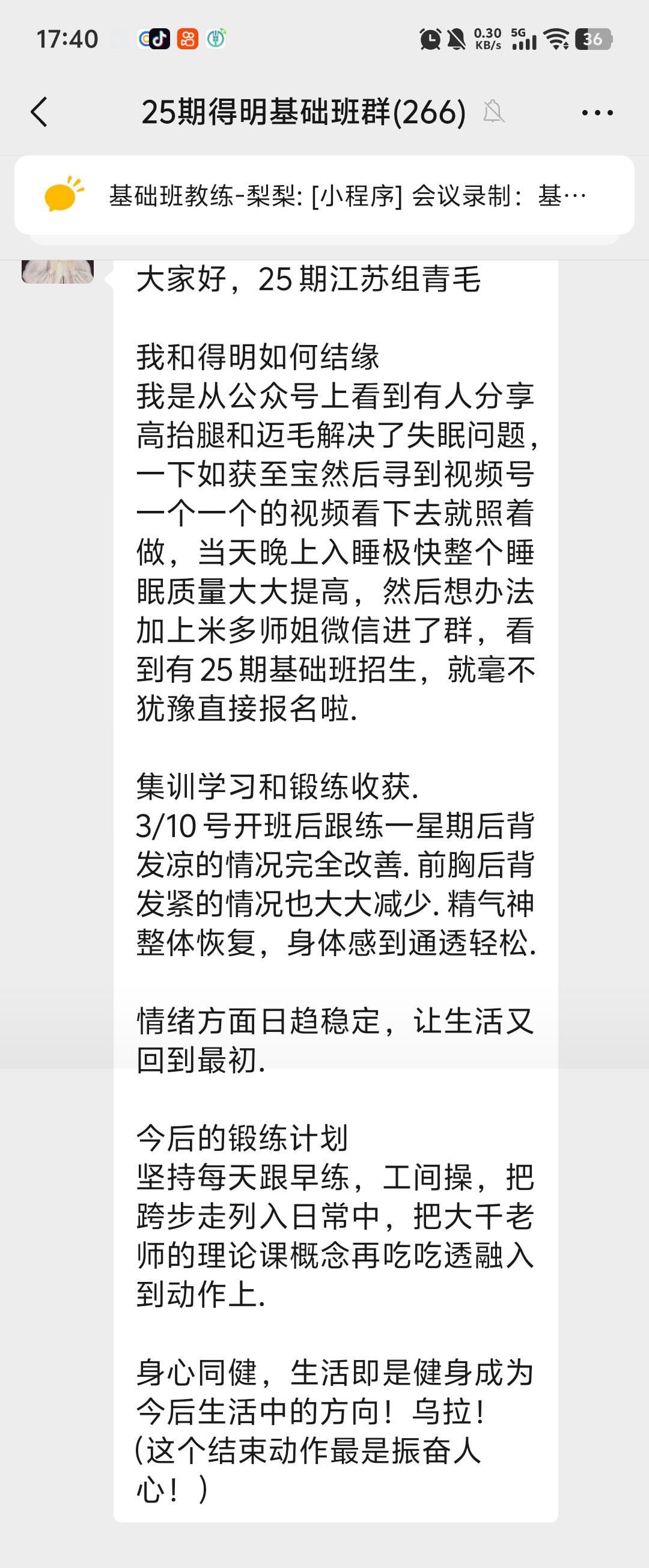 我是从公众号上看到有人分享高抬腿和迈毛解决了失眠问题,一下如获至宝然后寻到视频号一个一个的视频看下去就照着做,当天晚上入睡极快整个睡眠质量大大提高,然后想办法加上米多师姐微信进了群,看到有25期基础班招生,就毫不犹豫直接报名啦.