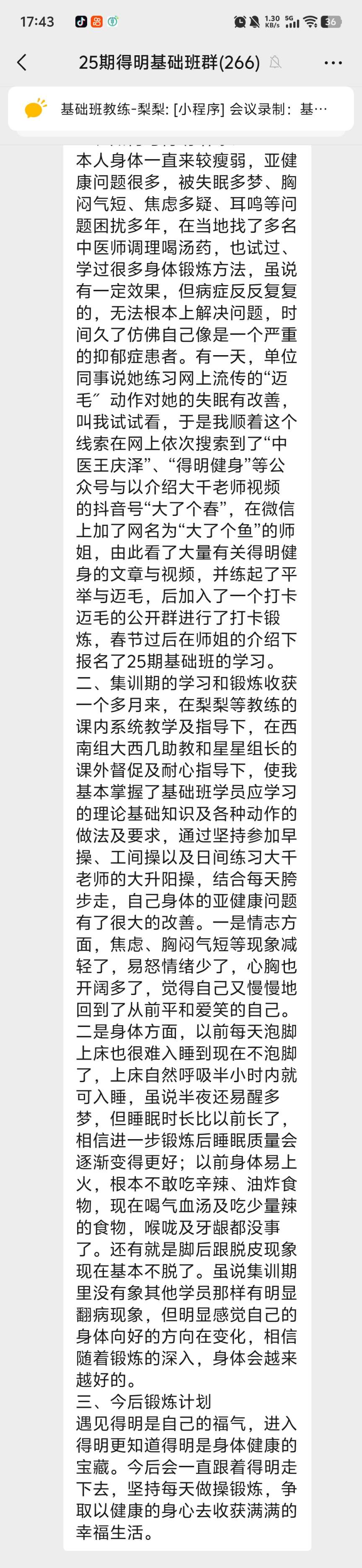 本人身体一直来较瘦弱,亚健康问题很多,被失眠多梦、胸闷气短、焦虑多疑、耳鸣等问题困扰多年,在当地找了多名中医师调理喝汤药,也试过、学过很多身体锻炼方法,虽说有一定效果,但病症反反复复的,无法根本上解决问题,时间久了仿佛自己像是一个严重的抑郁症患者。有一天,单位同事说她练习网上流传的“迈毛〞动作对她的失眠有改善,叫我试试看,于是我顺着这个线索在网上依次搜索到了“中医王庆泽”、“得明健身”等公众号与以介绍大千老师视频的抖音号“大了个春”,在微信上加了网名为“大了个鱼”的师姐,由此看了大量有关得明健身的文章与视频,并练起了平举与迈毛,后加入了一个打卡迈毛的公开群进行了打卡锻炼,春节过后在师姐的介绍下报名了25期基础班的学习。