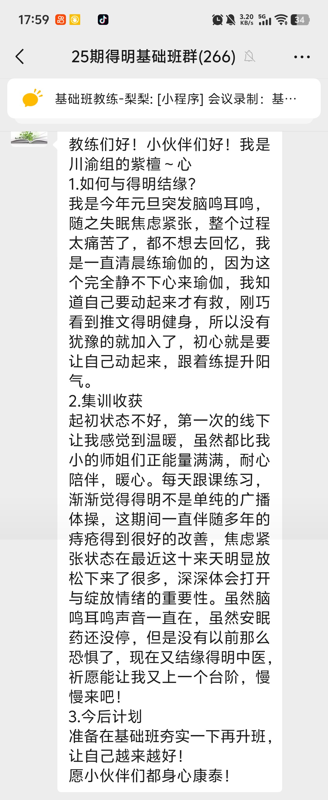 我是今年元旦突发脑鸣耳鸣,随之失眠焦虑紧张,整个过程太痛苦了,都不想去回忆,我是一直清晨练瑜伽的,因为这个完全静不下心来瑜伽,我知道自己要动起来才有救,刚巧看到推文得明健身,所以没有犹豫的就加入了,初心就是要让自己动起来,跟着练提升阳气。