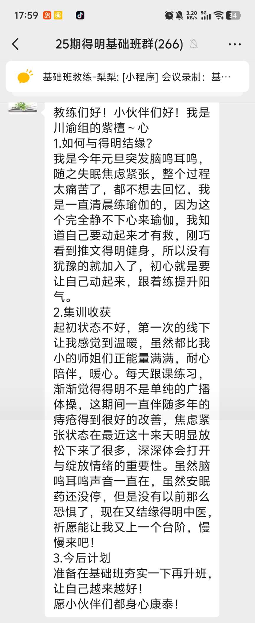 起初状态不好,第一次的线下让我感觉到温暖,虽然都比我小的师姐们正能量满满,耐心陪伴,暖心。每天跟课练习,渐渐觉得得明不是单纯的广播体操,这期间一直伴随多年的痔疮得到很好的改善,焦虑紧张状态在最近这十来天明显放松下来了很多,深深体会打开与绽放情绪的重要性。虽然脑鸣耳鸣声音一直在,虽然安眠药还没停,但是没有以前那么恐惧了,现在又结缘得明中医,祈愿能让我又上一个台阶,慢慢来吧!