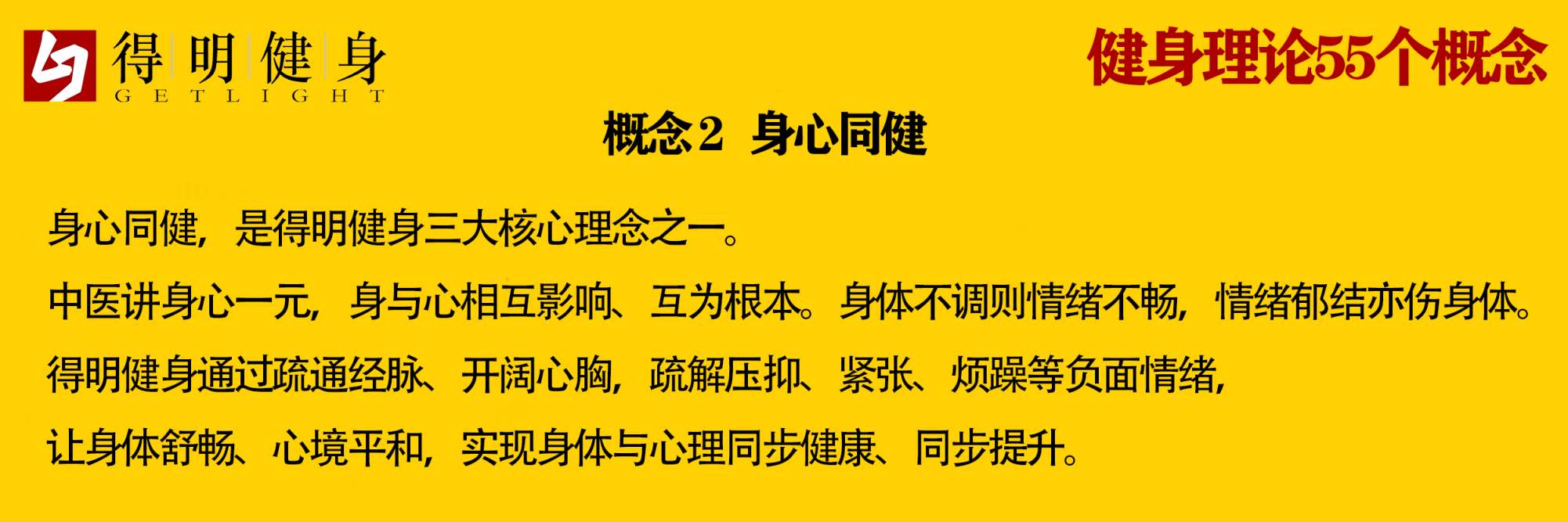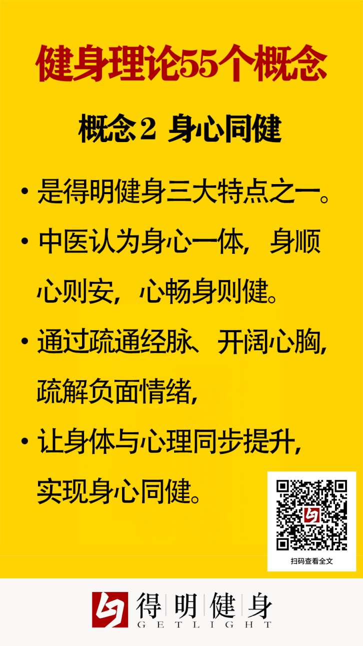 身心同健是得明健身提出的重要健身概念,是得明健身的三大特点之一。所谓身心同健,即着眼于身体与心理的共同健康。传统中医认为,身心一元,身体状态与心理活动和情绪相互影响,身体的不调会直接导致心理的不调,反之亦然,心理的不调也会直接导致身体的不调。人们平时产生的压抑、悲观、失落、易紧张,爱发火等负面情绪,除了与自己的心理有直接关系,也有可能是由于身体不调,进而影响到的心理活动。在得明健身的过程中,打开经脉,开阔心胸,可以使情绪得以有效的疏解,人的心情也会变得良好。同样良好的心情又会改善人的身体状态,使人轻松愉快。如果负面的情绪过多,容易损害身体。所以得明健身非常重视身体和心理的同时锻炼,从而快速提高身心状态,让身体和心理都处于健康状态。
