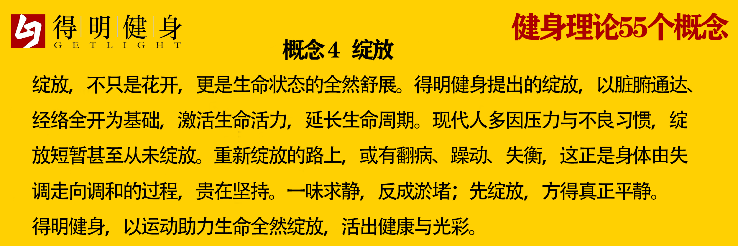 现代人由于不良的生活习惯以及各种压力,很多人绽放的时间非常短暂,又或者从未完全绽放过,得明健身就是要让大家重新绽放起来。身体重新绽放的过程也是处理各种不调的过程,会遇到各种各样的阻力,在此过程中会出现躁动、翻病或是不平衡的一些生理现象,此时要清楚地认识到这是一个从不调到调的过程,需要坚持不懈,持之以恒的锻炼,如果一味的强调平衡、平静,会阻碍绽放,甚至导致能量的淤闭。身体只有绽放之后才能真正的回归平静,没有绽放过的平静多是淤堵的表现,而现代很多人未绽放就已凋谢,得明健身就是通过各种形式的锻炼,让更多人实现生命的绽放,拥有更健康的人生。