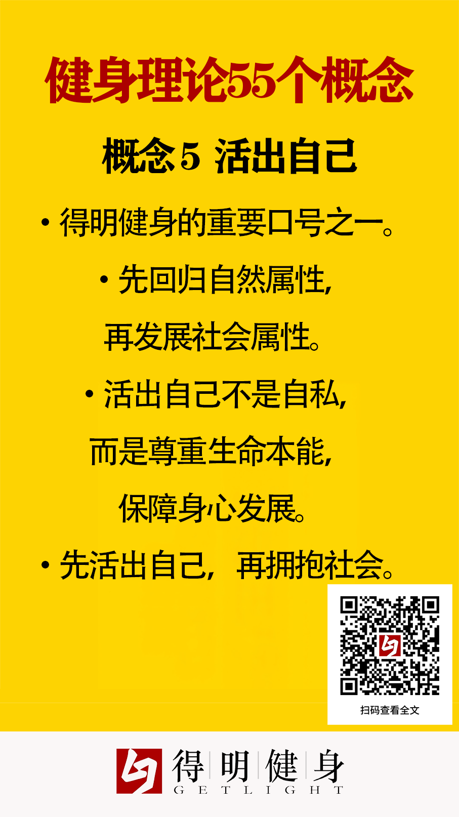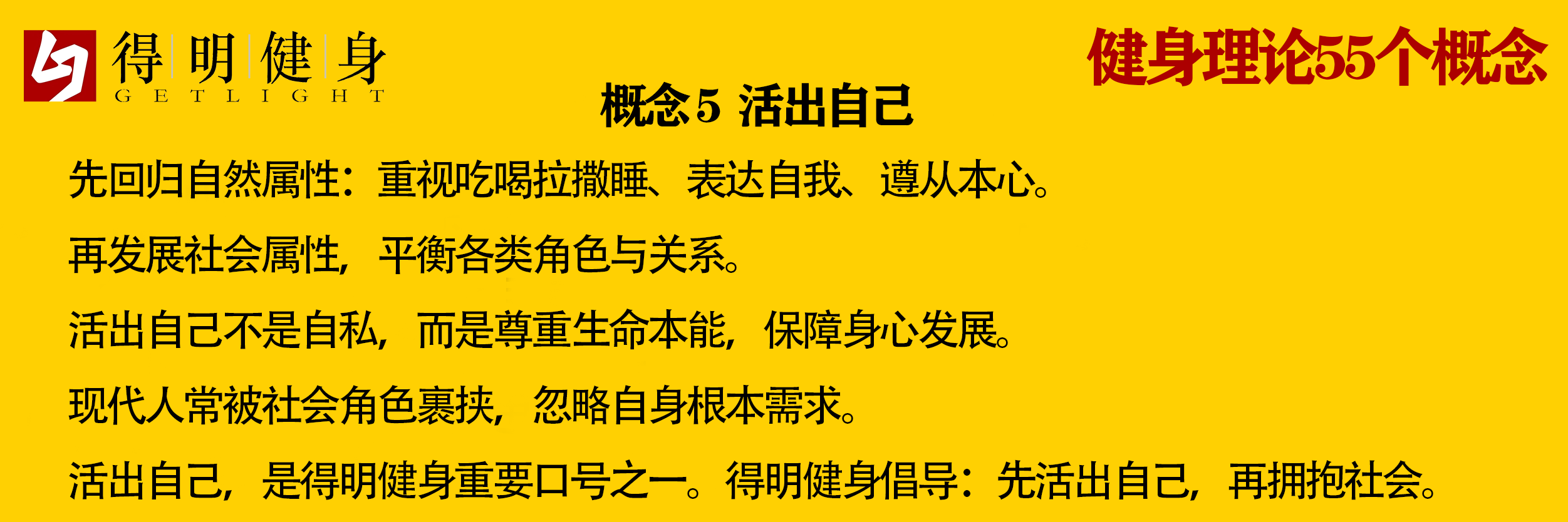 活出自己是得明健身提出的重要口号之一,提倡人先找回和重视自己基本的自然属性,比如吃喝拉撒睡等生理需要、自我意识的表达、性格爱好等等。在此基础上,再发展社会属性,比如一位成年女性,她可能要同时扮演好女儿、母亲、白领、闺蜜等各种角色,处理好和家人、同事、客户、朋友等其他人的关系 。活出自己,并非自私的只活自己,它是基于生命力的原始本能。任何生命体作为一个独立的个体首先需要生存、发展的权利,必须保证自己身心建设获得必要的资源,现代人被赋予太多的社会属性,而忽视了作为生命最基本的生存权、发展权,所以得明健身提出了活出自己的口号,让大家重视人的自然属性。