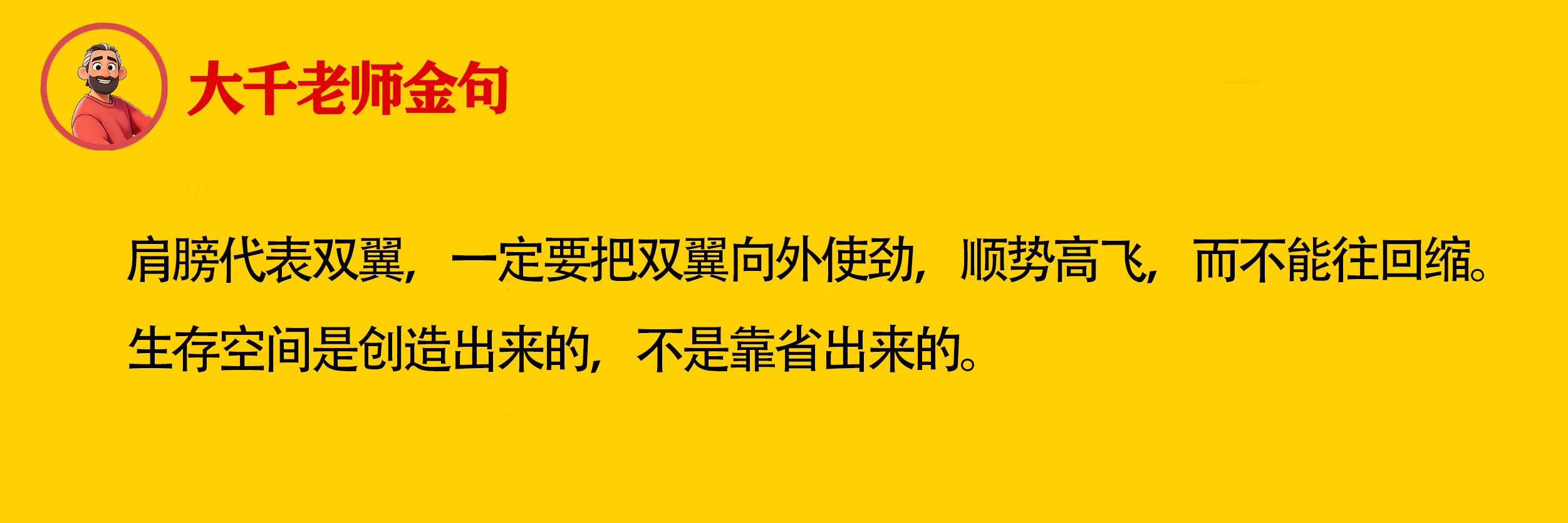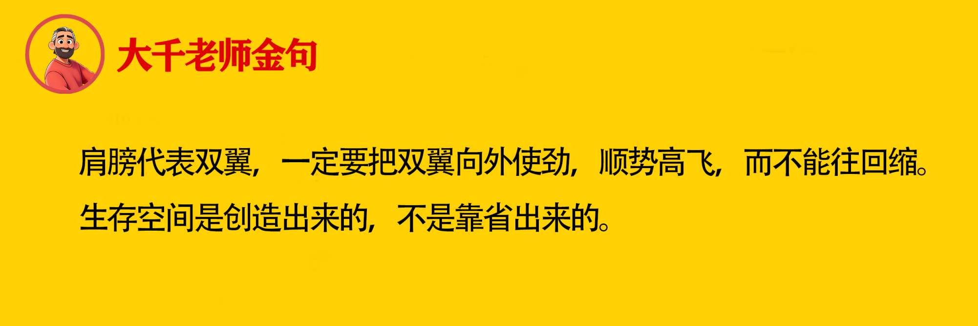 肩膀代表双翼,一定要把双翼向外使劲,顺势高飞,而不能往回缩。生存空间是创造出来的,不是靠省出来的。