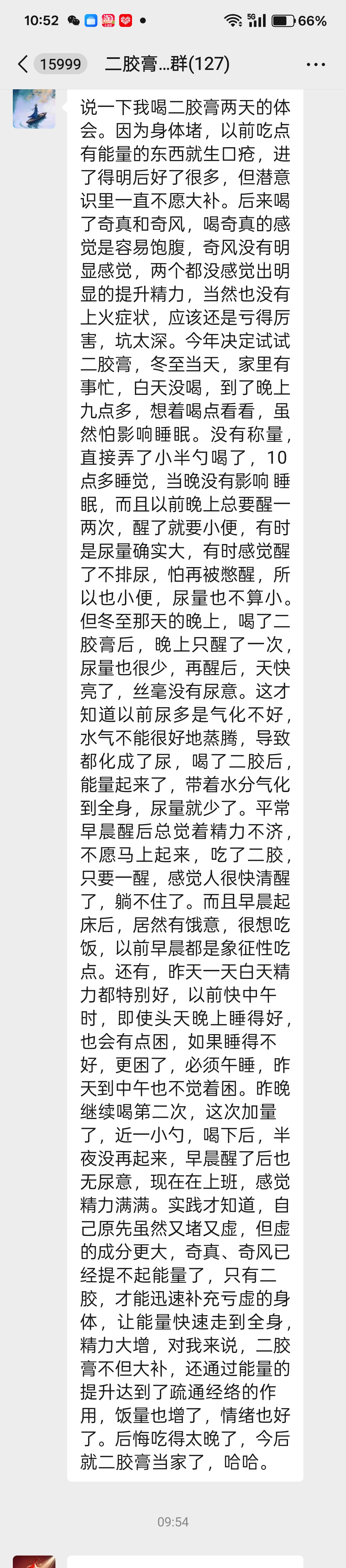 说一下我喝二胶膏两天的体会。因为身体堵,以前吃点有能量的东西就生口疮,进了得明后好了很多,但潜意识里一直不愿大补。后来喝了奇真和奇风,喝奇真的感觉是容易饱腹,奇风没有明显感觉,两个都没感觉出明显的提升精力,当然也没有上火症状,应该还是亏得厉害,坑太深。今年决定试试二胶膏,冬至当天,家里有事忙,白天没喝,到了晚上九点多,想着喝点看看,虽然怕影响睡眠。没有称量,直接弄了小半勺喝了,10点多睡觉,当晚没有影响 睡眠,而且以前晚上总要醒一两次,醒了就要小便,有时是尿量确实大,有时感觉醒了不排尿,怕再被憋醒,所以也小便,尿量也不算小。但冬至那天的晚上,喝了二胶膏后,晚上只醒了一次,尿量也很少,再醒后,天快亮了,丝毫没有尿意。这才知道以前尿多是气化不好,水气不能很好地蒸腾,导致都化成了尿,喝了二胶后,能量起来了,带着水分气化到全身,尿量就少了。平常早晨醒后总觉着精力不济,不愿马上起来,吃了二胶,只要一醒,感觉人很快清醒了,躺不住了。而且早晨起床后,居然有饿意,很想吃饭,以前早晨都是象征性吃点。还有,昨天一天白天精力都特别好,以前快中午时,即使头天晚上睡得好,也会有点困,如果睡得不好,更困了,必须午睡,昨天到中午也不觉着困。昨晚继续喝第二次,这次加量了,近一小勺,喝下后,半夜没再起来,早晨醒了后也无尿意,现在在上班,感觉精力满满。实践才知道,自己原先虽然又堵又虚,但虚的成分更大,奇真、奇风已经提不起能量了,只有二胶,才能迅速补充亏虚的身体,让能量快速走到全身,精力大增,对我来说,二胶膏不但大补,还通过能量的提升达到了疏通经络的作用,饭量也增了,情绪也好了。后悔吃得太晚了,今后就二胶膏当家了,哈哈。