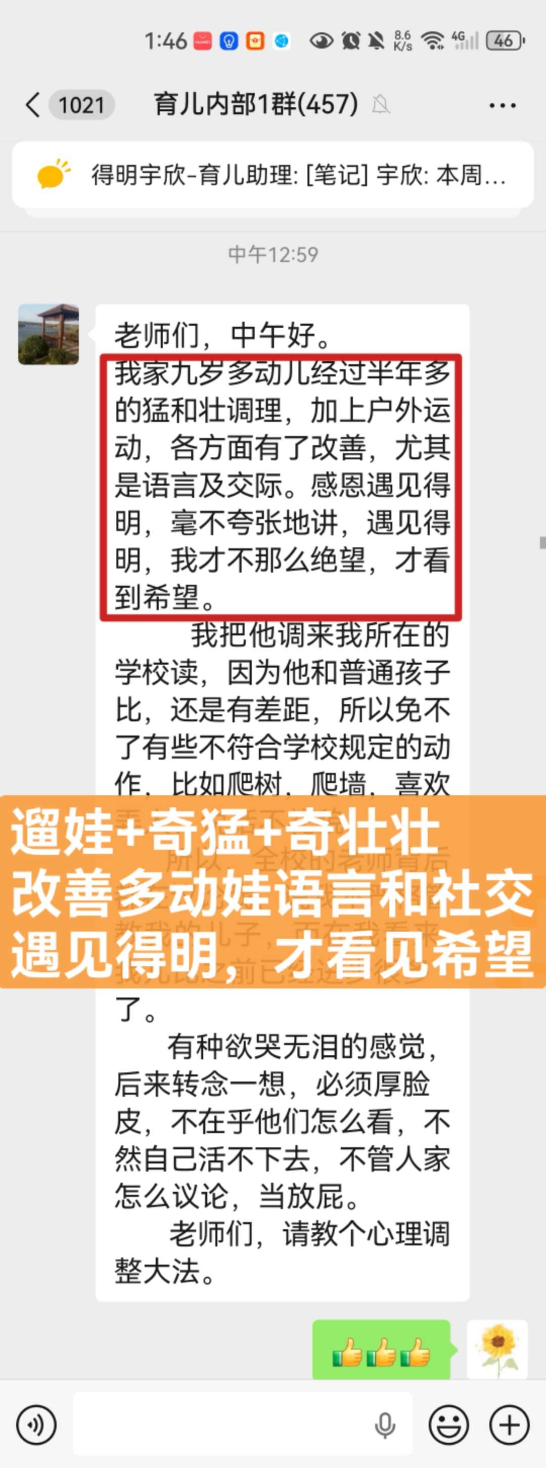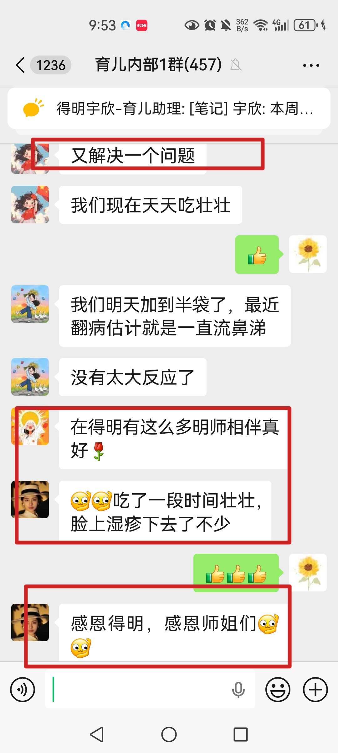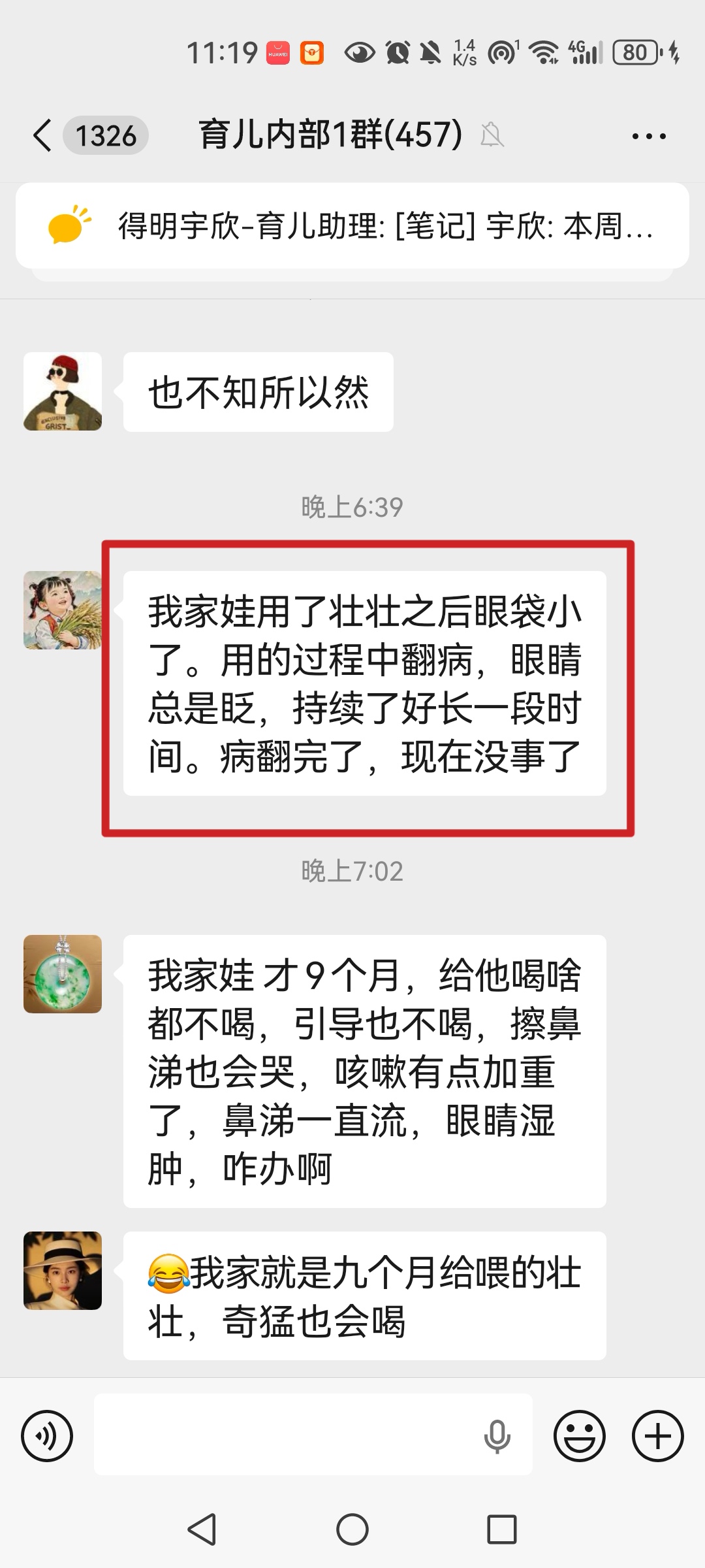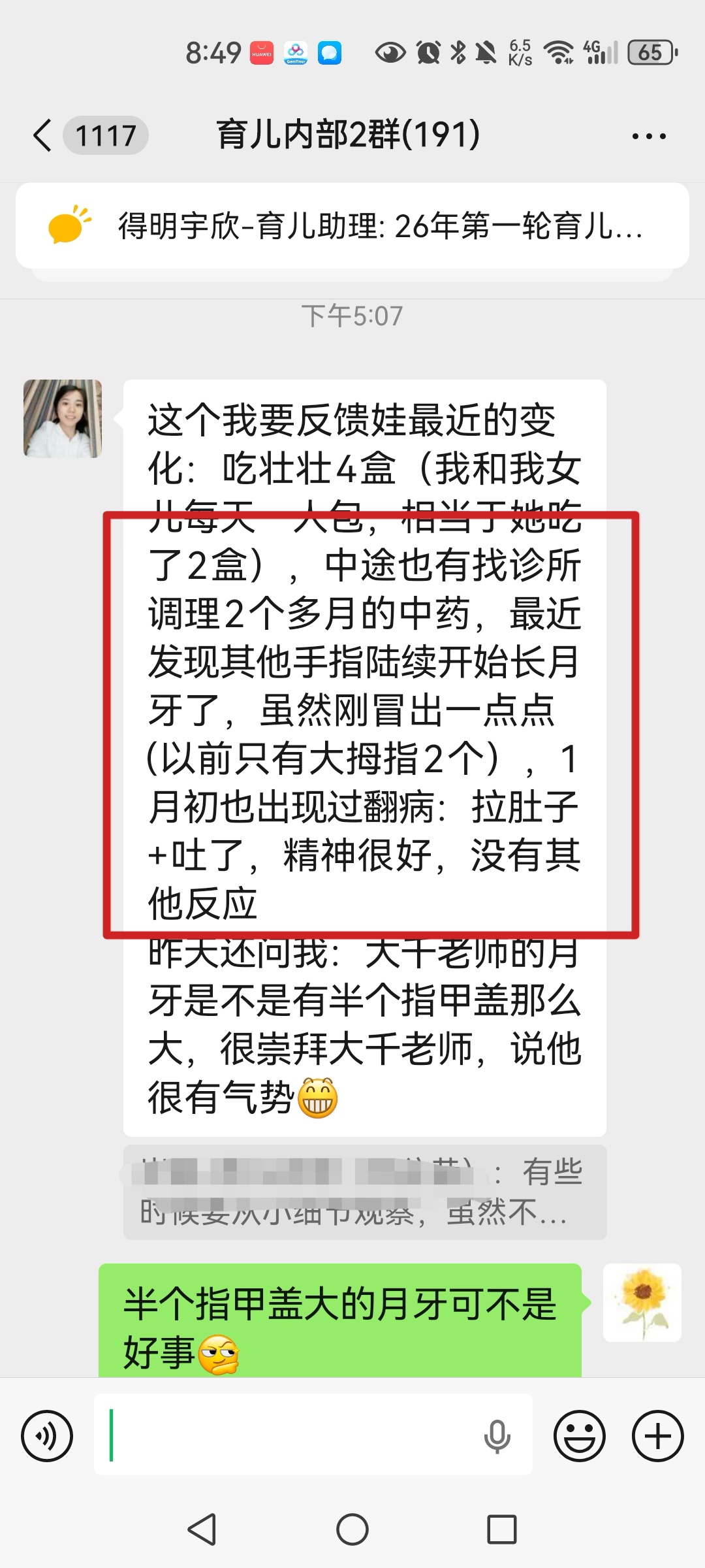这个我要反馈娃最近的变化:吃壮壮4盒(我和我女儿每天一人包,相当于她吃了2盒),中途也有找诊所调理2个多月的中药,最近发现其他手指陆续开始长月牙了,虽然刚冒出一点点(以前只有大拇指2个),1月初也出现过翻病:拉肚子+吐了,精神很好,没有其他反应