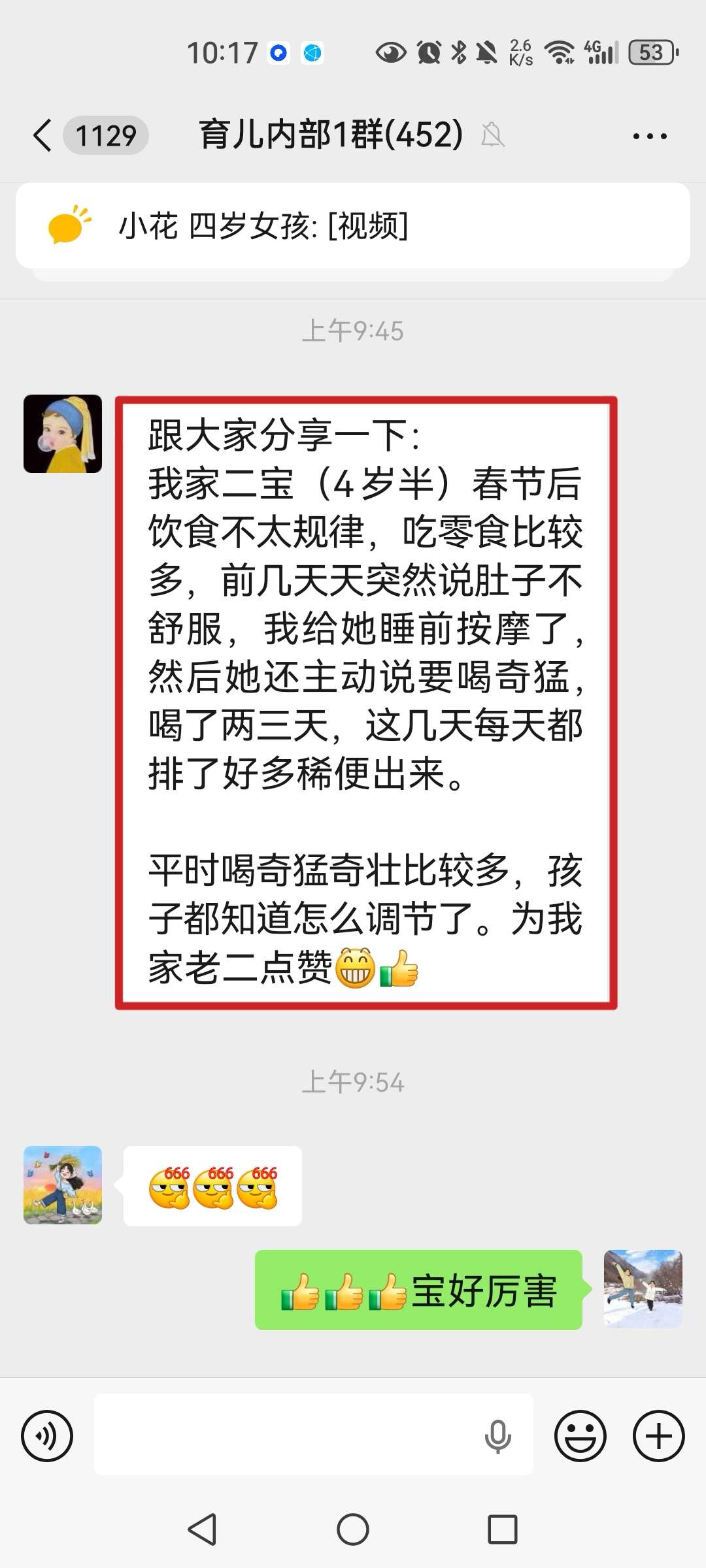 小儿便秘的我也来分享一下,我崽崽从25.12.13开始喝奇壮壮,每天1/3袋,除了12月底我崽有点特殊状况有一个礼拜左右没喝,到这两天有点看见上岸的曙光了,因为他最近这五天只有一天没拉臭。拉得也慢慢成型了!我至今还记得他第一天喝完第二天早上起床,给他换尿不湿,摸着他的双小腿至脚底板滚烫,给了我一个大大的惊喜!他以往不挨着我睡这一截都不热乎。后面的排病反应有但不限于拉大蒜味的💩、放🧄味的屁,睡前肚脐痒(现在也还有),右胯骨尖附近痒,左脚胆经阳交穴位置痒(均被他挠破皮已结痂)。最近三四个晚上开始不趴着睡。